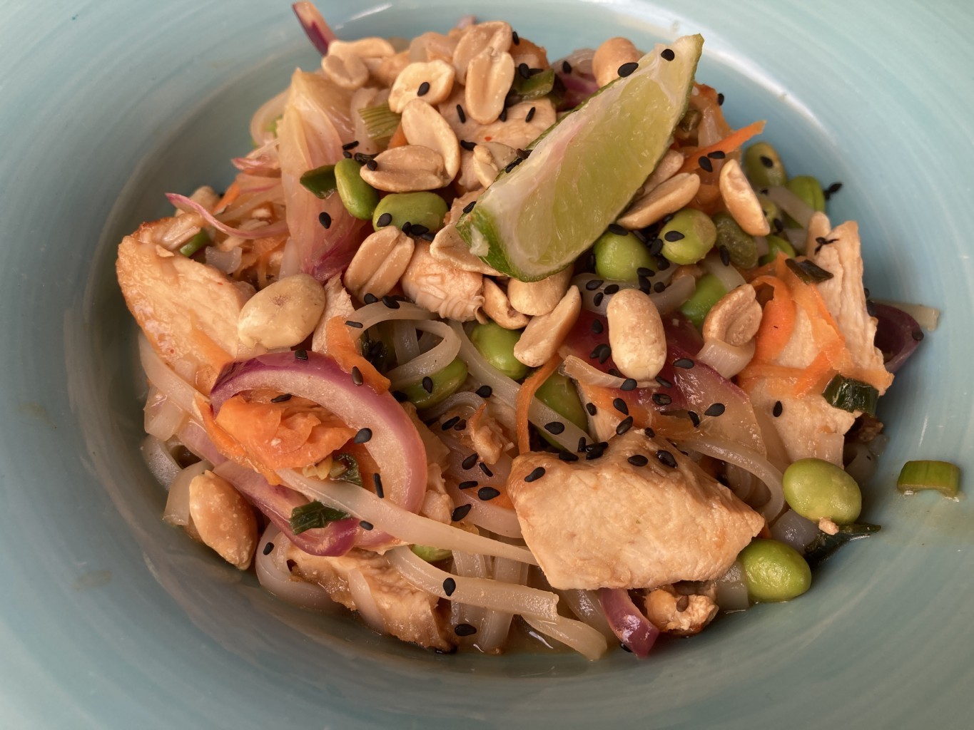 Dobre robia aj pražené ryžové rezance Pad Thai (7,90 €) - podľa kolegyne boli bez chyby, kolegovi však chutili trochu diétne, okrem jemnej šťavy z limetky sa mu žiadalo pridať pár kvapiek pikantnejšej omáčky... tak si vyberte. Thajské rezance sme si objednali s kuracím mäsom (mohli byť aj s tofu) a dopriali nám ho naozaj dosť, čo potešilo. Príjemným prekvapením boli zelené fazuľky, mix chutí zintenzívnili arašidy. Veľkých kusov cibule sme však mali na tanieri až príliš, zopár z nich sme radi oželeli.