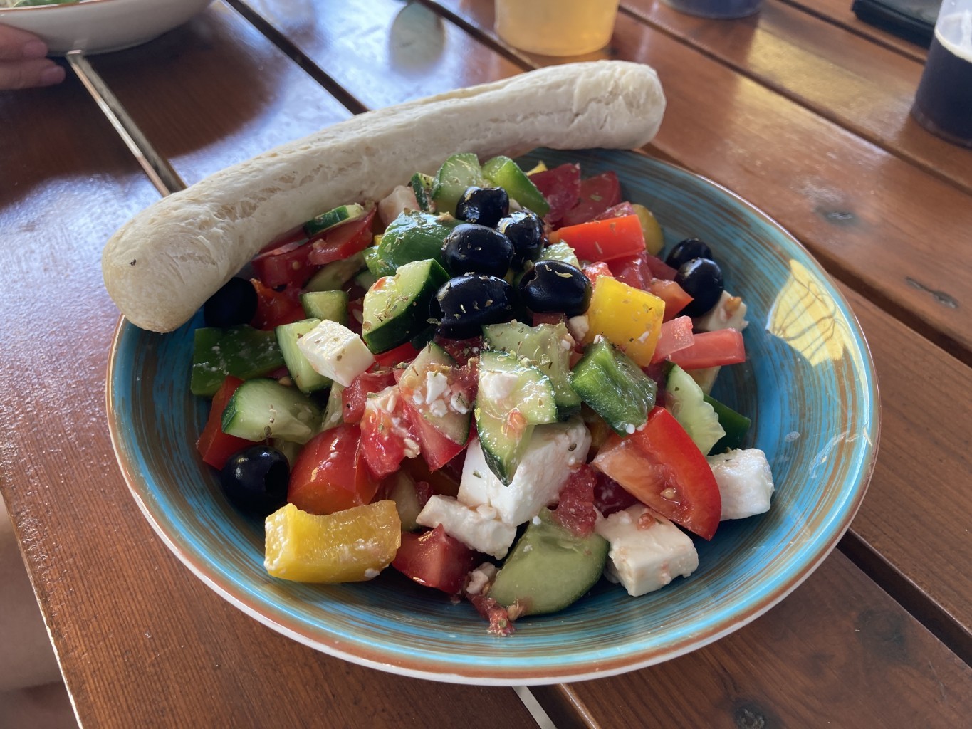 Nesklamal ani Grécky šalát (5,50 €), ak je zelenina čerstvá, nie je čo pokaziť, a syr gréckeho typu k tomuto sviežemu jedlu patrí. Paradajok však mohlo byť viac, prijali by sme tiež výraznejšiu chuť byliniek. Pizza tyčinka k šalátu bol super nápad.