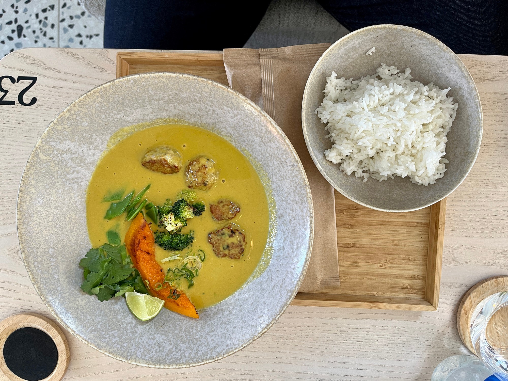Ďalšou našou voľbou boli nádherné farebné misky v dvoch verziách. Vegetariánsky Šošovicový kari bowl (9,40 €) obsahuje šošovicové guľôčky vlastnej receptúry, zaliate štedrou dávkou vynikajúcej karí omáčky, sladkej a pikantnej zároveň, ale nič prehnané. K tomu čerstvá zelenina a biela ryža. Kombinácia chutí veľmi zaujímavá, určite odporúčame! Kurací kari bowl (10,90 €) bol rovnako skvelým zážitkom, mäsko šťavnaté, jemné, všetko dohromady výborne ochutené a jednoznačne z čerstvých surovín.