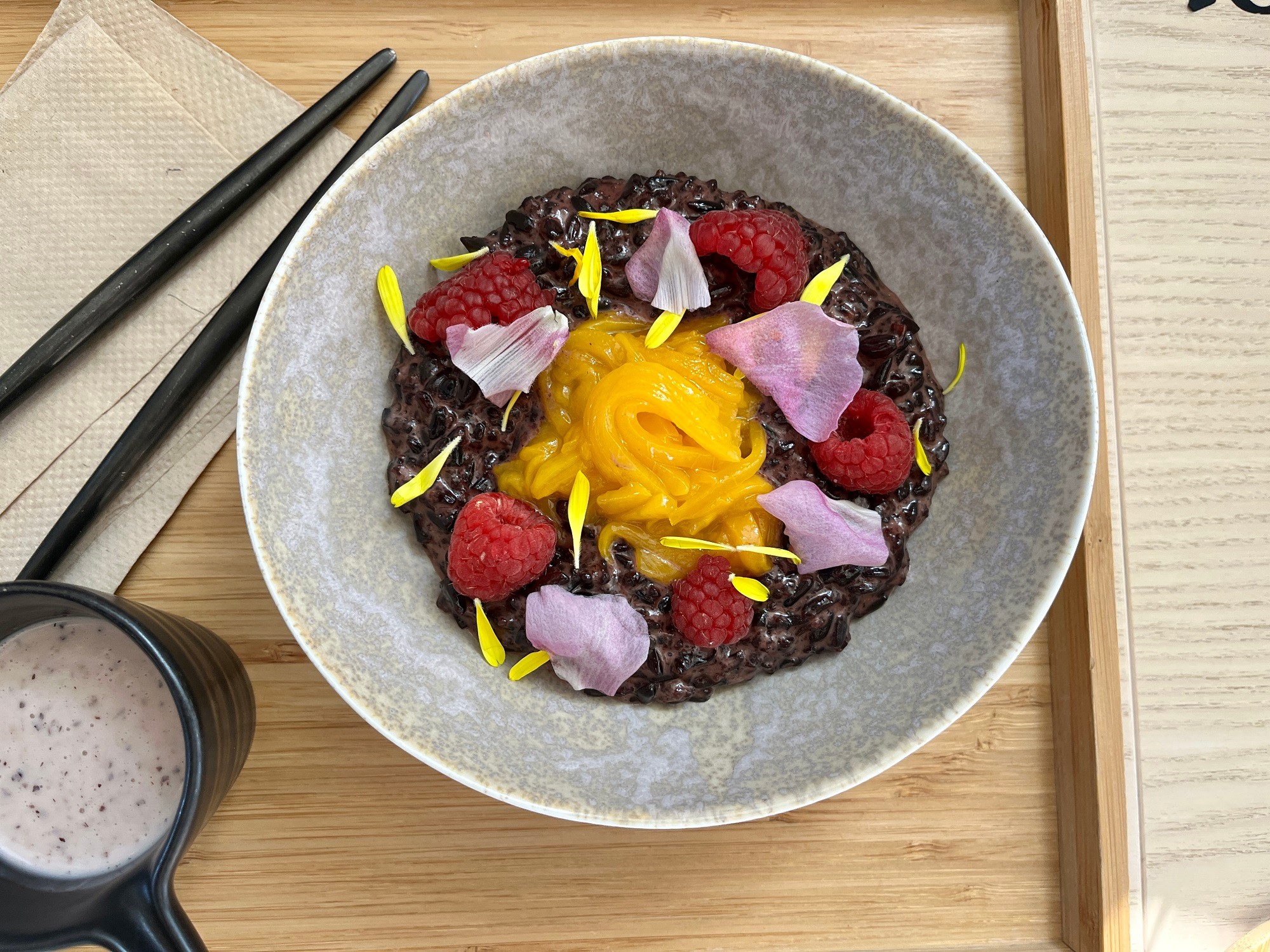 Hodovanie sme zavŕšili thajským dezertom Mango sticky rice (6,90 €). My ho poznáme s bielou ryžou, no verzia s čiernou, ktorú nám priniesli, v ničom nezaostáva. Maškrta dochutená domácou vegánskou zálievkou bola lahodná. K nej nám dobre padla osviežujúca limonáda St. Camu (3,90 €), pripravená zo šťavnatých jahôd a amazonského superovocia Camu Camu s najväčším obsahom vitamínu C. A aby toho zdravého nebolo málo, dopriali sme si aj limonádu Locoberry (3,90 €) so sviežimi malinami a kanadským sirupom, nabitú cennými vitamínmi a minerálmi.