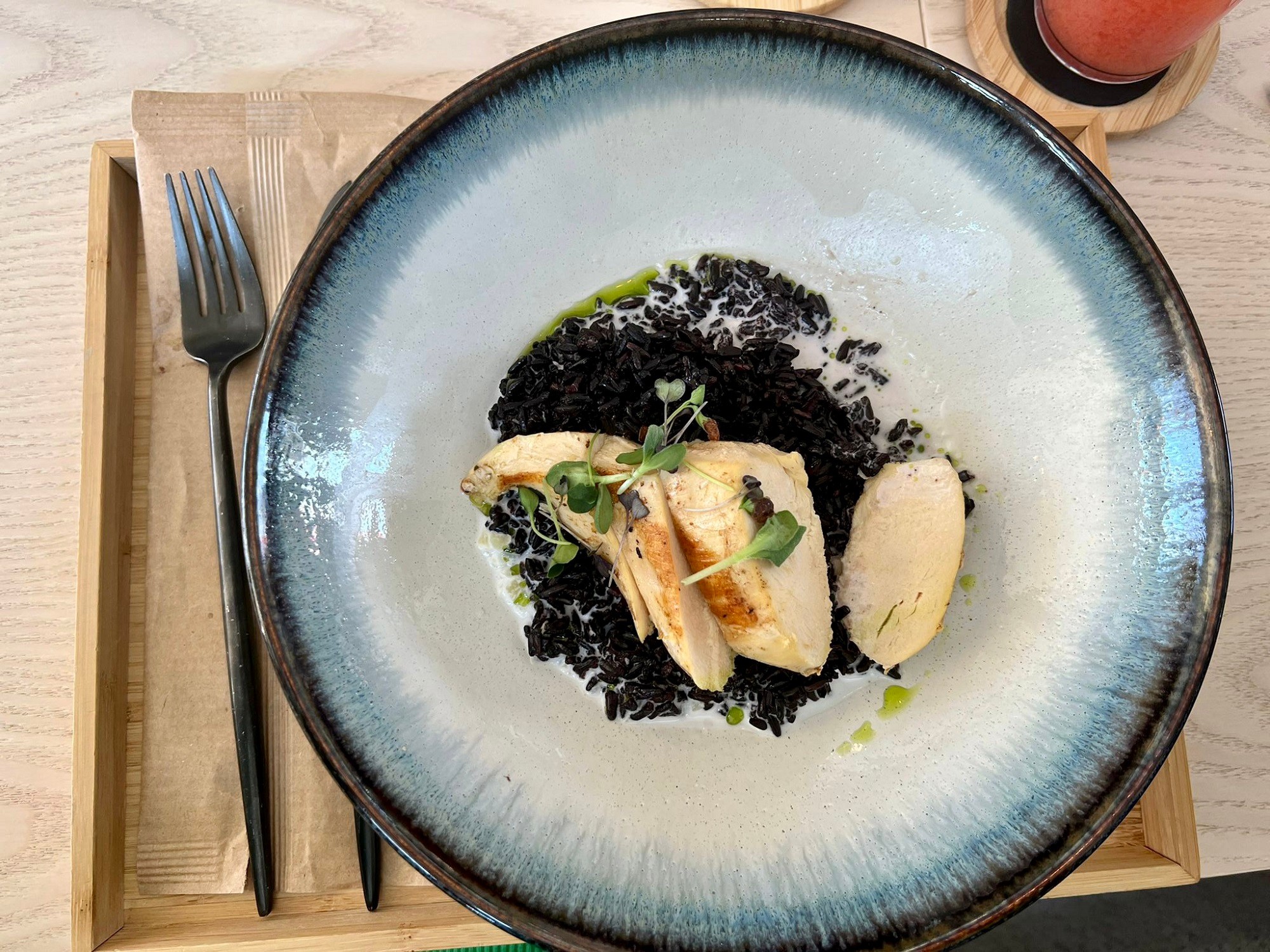 Po polievke sme vyskúšali Kuracie prsia s citrónovou trávou (10,90 €) a urobili sme dobre. Boli šťavnaté a jemné, lahodnosť jedla podčiarklo kokosové mlieko. A netradičnosť mu dodala exotická superpotravina – čierna ryža, plná antioxidantov.