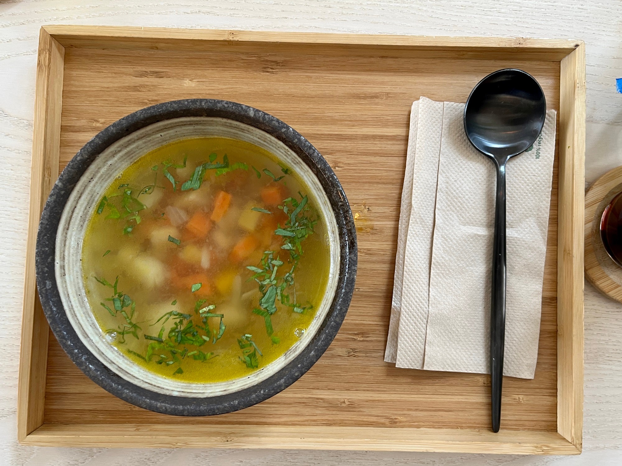 Začali sme Zeleninovou polievkou s ligurčekom (2,90 €), ktorá už z diaľky krásne zavoňala. Postaral sa o to nepochybne najmä ligurček, nasekaný na drobné kúsky, ktorý prospel aj výslednej chuti, bola svieža, jarná. Mrkvy, petržlenu, kalerábu a cibule bolo v miske bohato, to máme radi. K ligurčeku ešte toľko, že je účinným detoxikačným prostriedkom, nezabúdajte naň ani vo svojej domácej kuchyni.