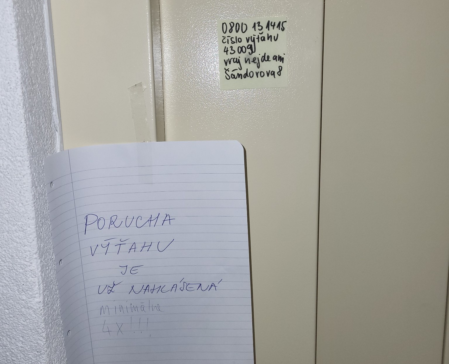 Vysvetľuje, že s týmto typom výťahu mali nedávno veľký problém aj vo vedľajšom vchode. Dvere kabíny na štvrtom poschodí sa zasekávali, nedali sa otvoriť, dokonca raz v kabíne uviazla rodina s bábätkom – deň po obhliadke technikom! Viackrát vraj bolo potrebné ľudí z výťahu vyslobodzovať. Technici síce prichádzali, ale tá istá porucha sa dookola opakovala. Trvalo celé mesiace, kým ju servisná firma definitívne odstránila. Najnovšie sa však v bytovke opäť objavil oznam, že výťah nefunguje...