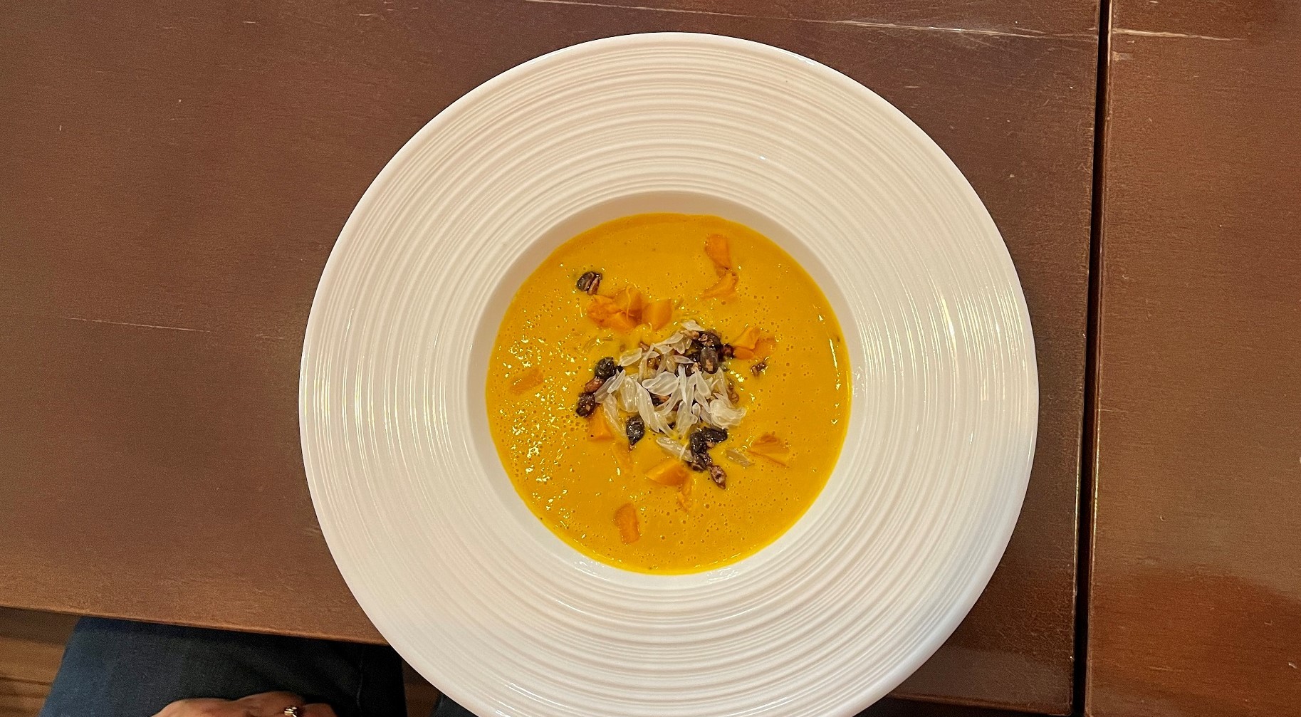 V Tekvicovej polievke (4,90 €) by ste asi dužinu pomela nečakali a bol to dobrý nápad. Osviežujúci citrus spolu s pikantnejším zázvorom podčiarkli skvelý dojem, ktorý dotiahli chrumkavé tekvicové semienka a kúsky lahodnej tekvice. Polievka, servírovaná v elegantnom hlbokom tanieri, bola teplá presne ako treba a skutočne znamenitá.