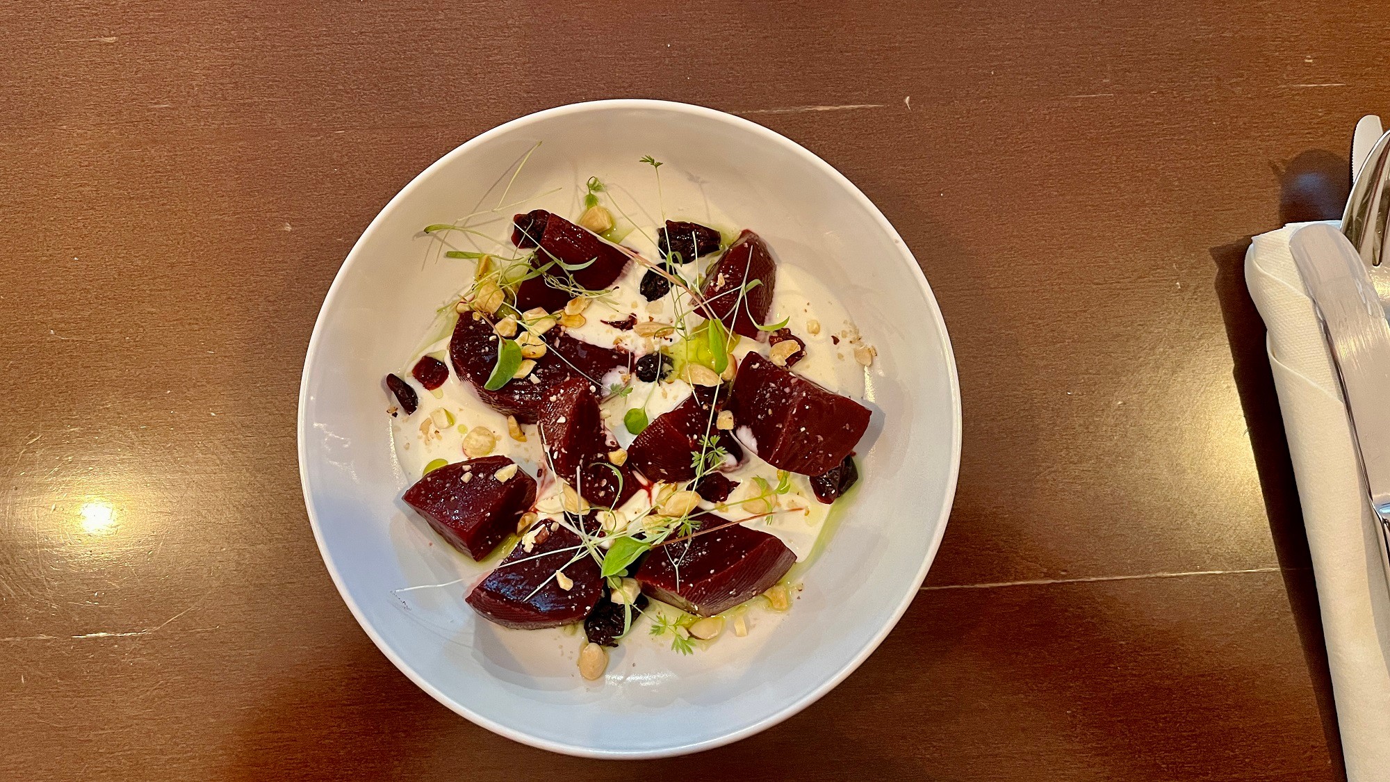 Červenú repu s kozím tvarohom (5,90 €) nám prezentovali ako predjedlo, ale štíhlej paničke dokáže pokojne nahradiť hlavné jedlo, porcia obohatená o brusnice a oriešky bola naozaj výdatná. Ak poznáte chuť kozieho syra, budete asi trochu prekvapení, tvaroh bol totiž príjemne zjemnený, vôbec nerušil chuťové kanáliky. Aj cviklu nám pripravili pekne na zahryznutie, takže ak máte túto kombináciu radi, odporúčame, určite si pochutíte.