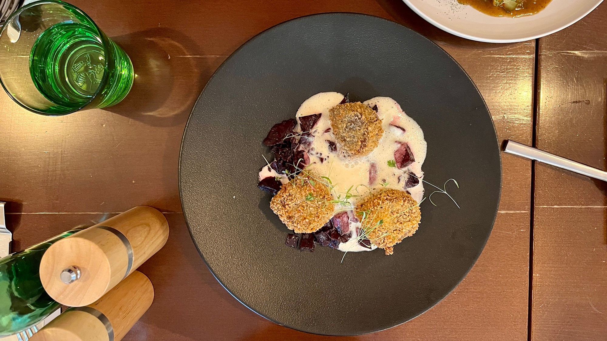 K vyprážaným kačacím kroketám (12,90 €) sme mali prívarok z dusenej červenej kapusty a repy, preliaty penou, v ktorej sa chrenom nešetrilo - špecialite dodal pikantnosť, ktorá tiež potešila. Jemné mäsko v trojobale v kombinácii so zaujímavo dotvorenou jesennou zeleninou bolo príjemným chuťovým aj vizuálnym zážitkom.