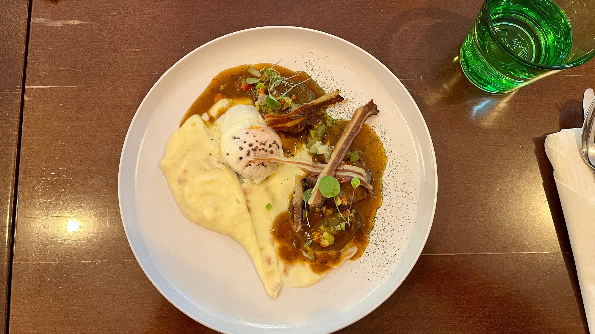 Pri objednávaní „Španielskeho vtáčika“ (13,90 €) sme si všimli úvodzovky v názve jedla. Už tie nám avizovali, že bude mať ďaleko od klasiky, ktorú si pamätáme zo školskej jedálne. Dostali sme modernú verziu pripravenú z duseného hovädzieho lúpaného pleca, s plátkami pancetty a vajíčka, ktoré sa nám na tanieri pekne roztieklo, k tomu bola ešte zemiaková kaša s cibuľkou a pickles. Chutné mäsko sa až rozpadávalo na jazyku, výborné bolo aj zemiakové pyré a „sós“, na ňom sme si tiež zgustli.