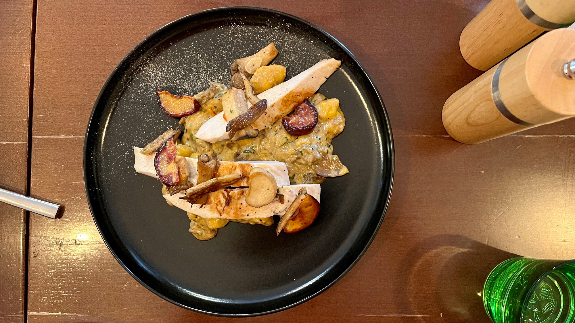 Ak sa v reštauráciách vyhýbate jedlám z kuracích pŕs, pretože mäso je suchšie, tak v MenJu nič podobné nehrozí. Farmárske kura - hríbové ragú (12,90 €) s domácimi tekvicovými gnocchi bolo výborné, mäsko vláčne, šťavnaté. Šéfkuchár Martin Korbelič nám prišiel prezradiť postup priamo k stolu: kuracie prsia pripravujú metódou sous vide, navyše ho naložia do jogurtu a čarujú s ním aj všelijako inak... Výsledok bol, že všetko to spolu na tanieri úžasne hralo a chutilo. A porcia oveľa väčšia, ako by ste čakali od jedla z menu.