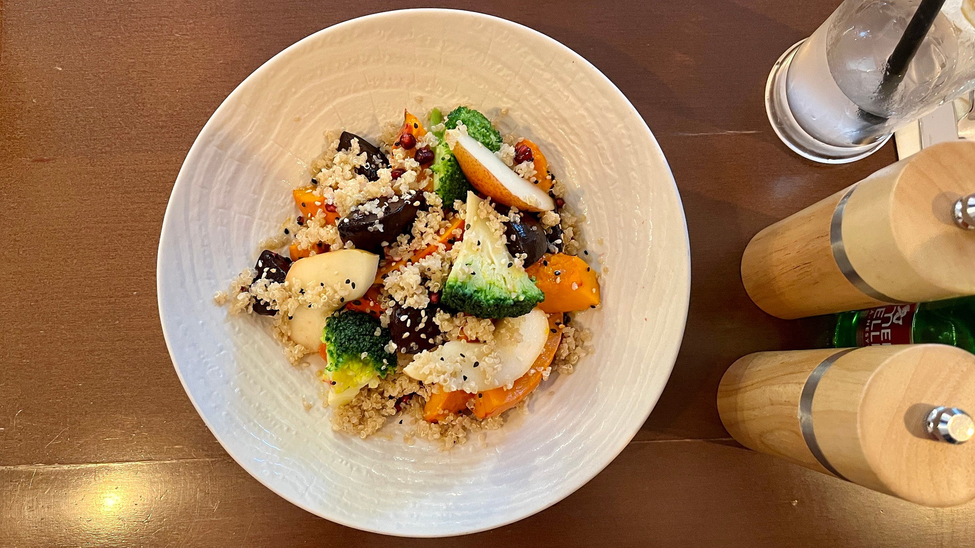 Smolu sme však mali na Jesenný šalát (10,90 €). Obsahoval síce všetko, čo máme radi - pečenú hokkaido tekvicu, cviklu, ružičky brokolice, kúsky hrušky aj zrnká granátového jablka, tiež štedrú dávku quinoy... Ale chuťovo bol úplne diétny. Napokon vysvitlo, že nám ho pripravil kuchársky začiatočník, ktorý vraj zabudol pridať dresing, a zjavne i niečo ďalšie na dochutenie. Škoda. Toto jediné nám chýbalo k dokonalému zážitku.
