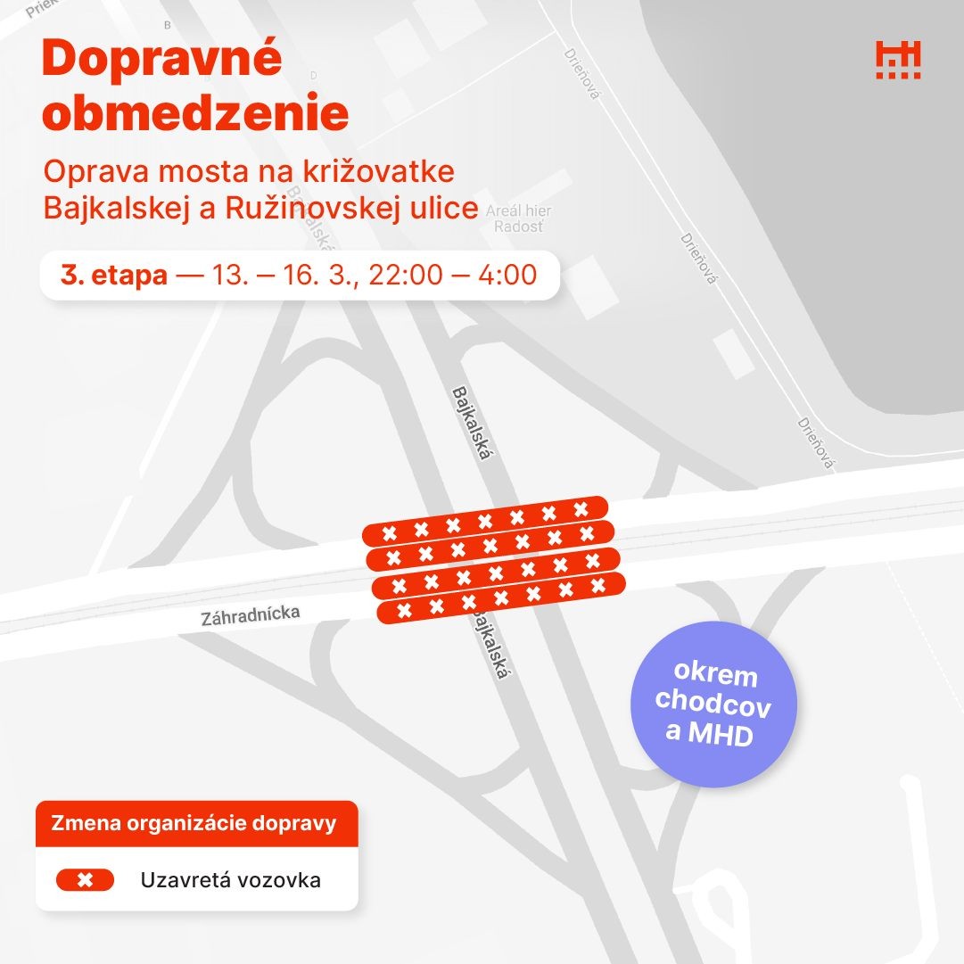 V súvislosti s opravou mostov na križovatke Bajkalskej a Ružinovskej ulice dôjde v nočných hodinách od 9. do 16. marca k dopravným obmedzeniam na Ružinovskej ulici. Počas prác bude mestská časť odstraňovať uvoľnené časti betónu z oboch mostov a vykonávať aj čiastočnú opravu ríms, ktoré opadávajú na električkovú trať a cestu pod mostami.