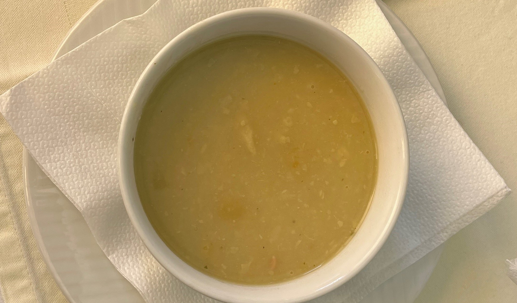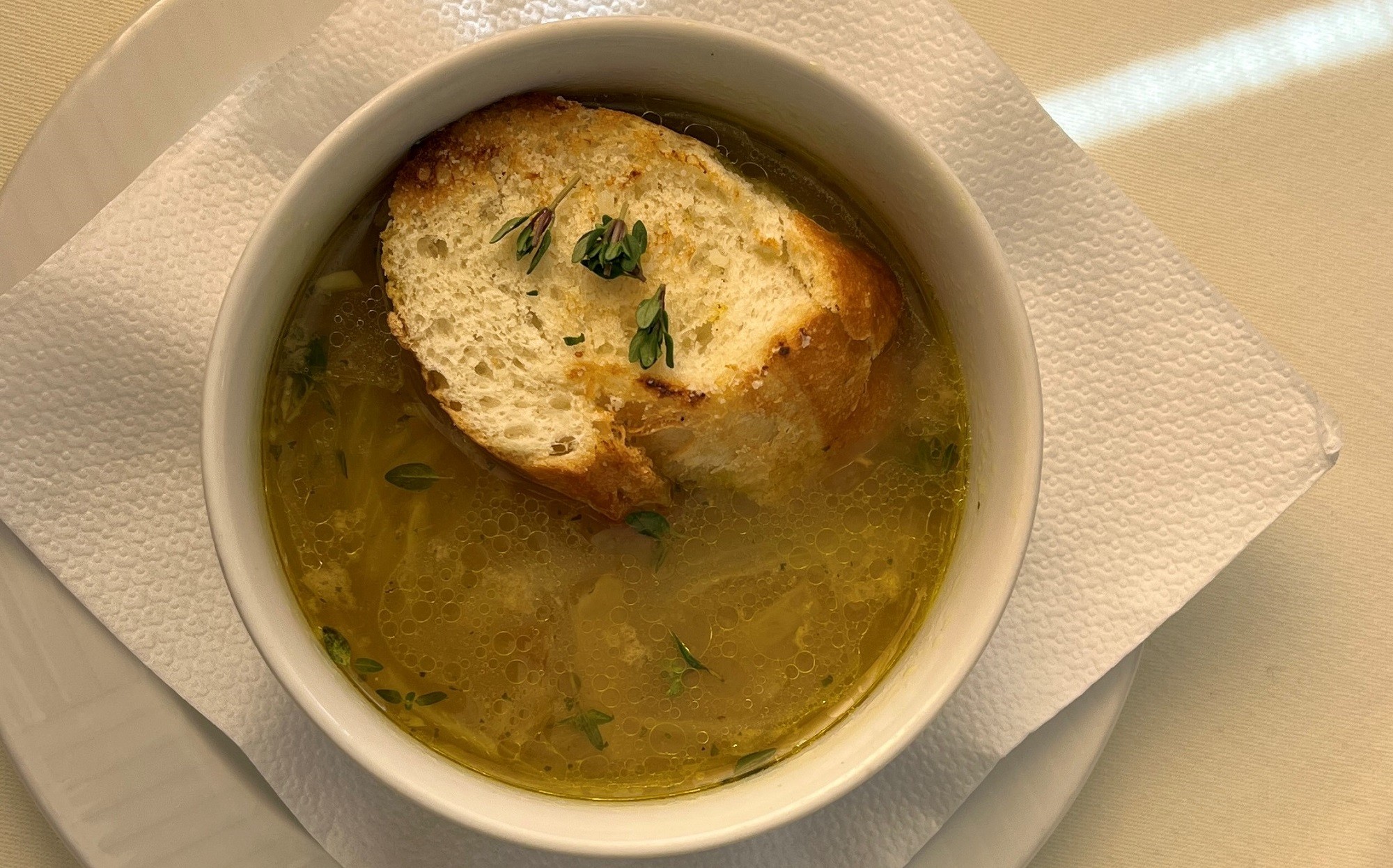Z polievok boli v čase našej návštevy v ponuke dve a otestovali sme obe. Francúzska cibuľačka s čerstvým tymiánom a zapekanou bagetkou s parmezánom (2,99 €) mala hladkú krémovú konzistenciu so všetkými karamelizovanými chuťami, ktoré k nej prináležia. Bola to výživná a sýta polievka, ktorá splnila všetky naše očakávania.