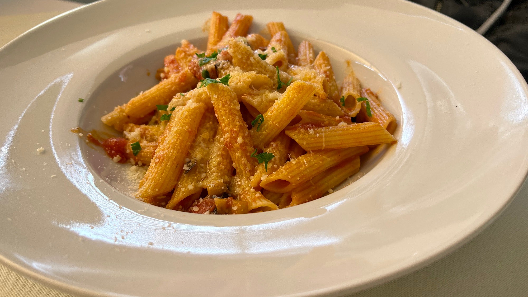 Potešili napríklad cestoviny Penne s rajčinami, baklažánom a syrom Grana Padano (6,99 €). Jedlo bolo výborne dochutené, baklažán a rajčiny čerstvé, možno penne mohli byť trochu viac al dente, ale to je asi jediná výhrada. Skrátka, jednoduchý dobrý obed za slušnú cenu.