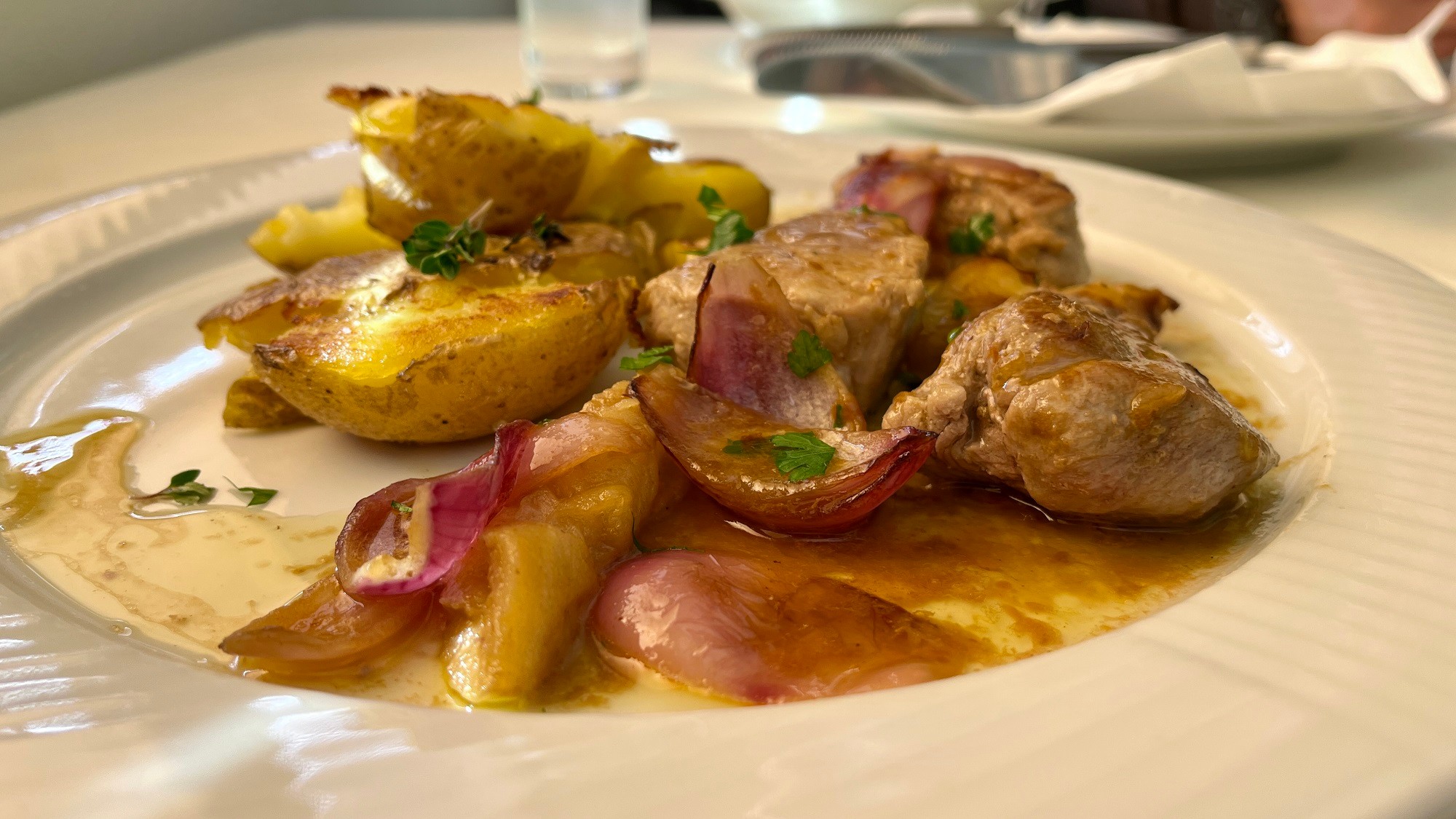 Špecialita s názvom Mignon z bravčovej panenky (12,99 €) so sedliackymi zemiakmi nás príjemne prekvapila už vizuálom, v ktorom boli zakomponované i hrušky. Čo sa týka mäska, panenku medium rare síce preferujeme viac, ale aj táto vo verzii medium ulahodila. Zaujal nás tiež spôsob prípravy zemiakov: boli uvarené v šupke vcelku, potom jemne stlačené a následne zapečené. Chutili skvele.