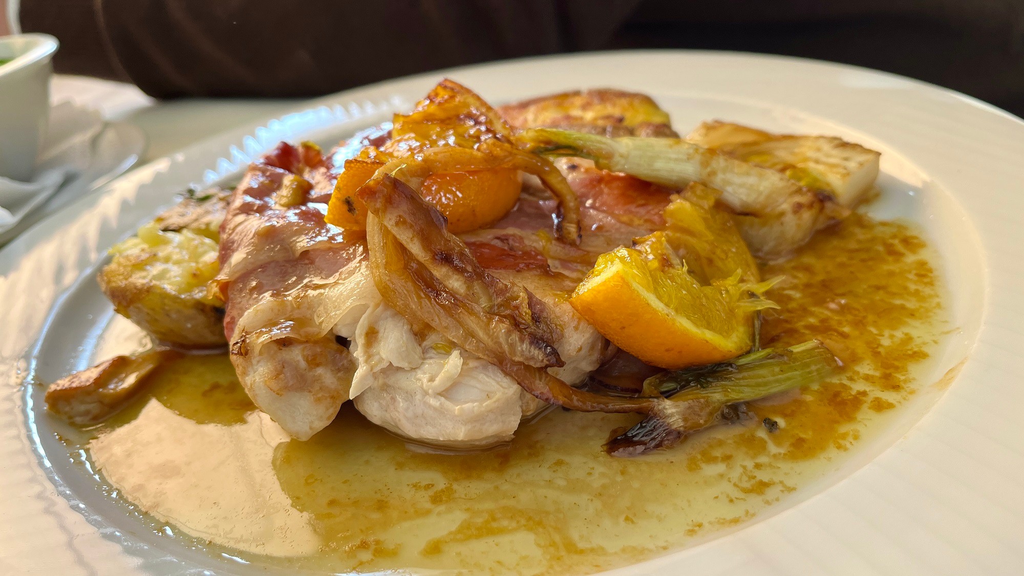 Zvedaví sme boli na Grilované kuracie prsia v prosciuttovom kabátiku (12,99 €), názov znel sympaticky. K tejto špecialitke sme dostali opäť sedliacke zemiaky a grilovaný fenikel. Mäso z kuracích pŕs bolo šťavnaté a chutné, k čomu prispela chrumkavá šunka prosciutto a ďalšie chute vrátane osviežujúceho pomaranča. O zemiakoch sme písali vyššie, tak už len dodávame, že by sme si ich kedykoľvek dali aj samotné.