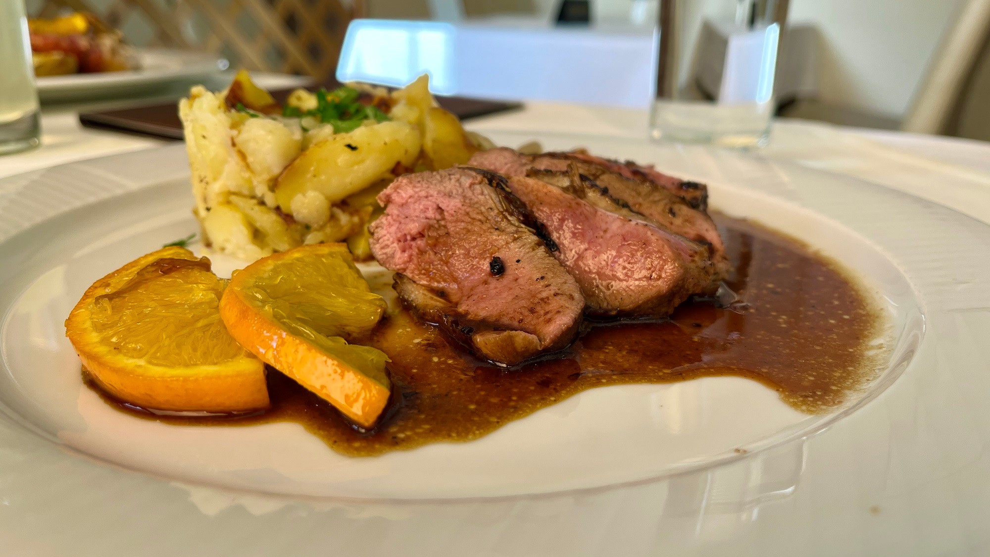Nesklamali ani Grilované kačacie prsia s pomarančom a karamelizovanou cibuľkou, ku ktorým sme mali šťuchané zemiaky (14,99 €). Bola to naozaj delikatesa, mäsko prepečené stredne, medium, pre niekoho možno slanšie, záleží na tom, ako ho máte radi. Skvostná omáčka pekne dotiahla všetky chute, vychutnali sme si aj zemiačiky, tých však bolo na tanieri skromnejšie, prijali by sme väčšiu porciu.
