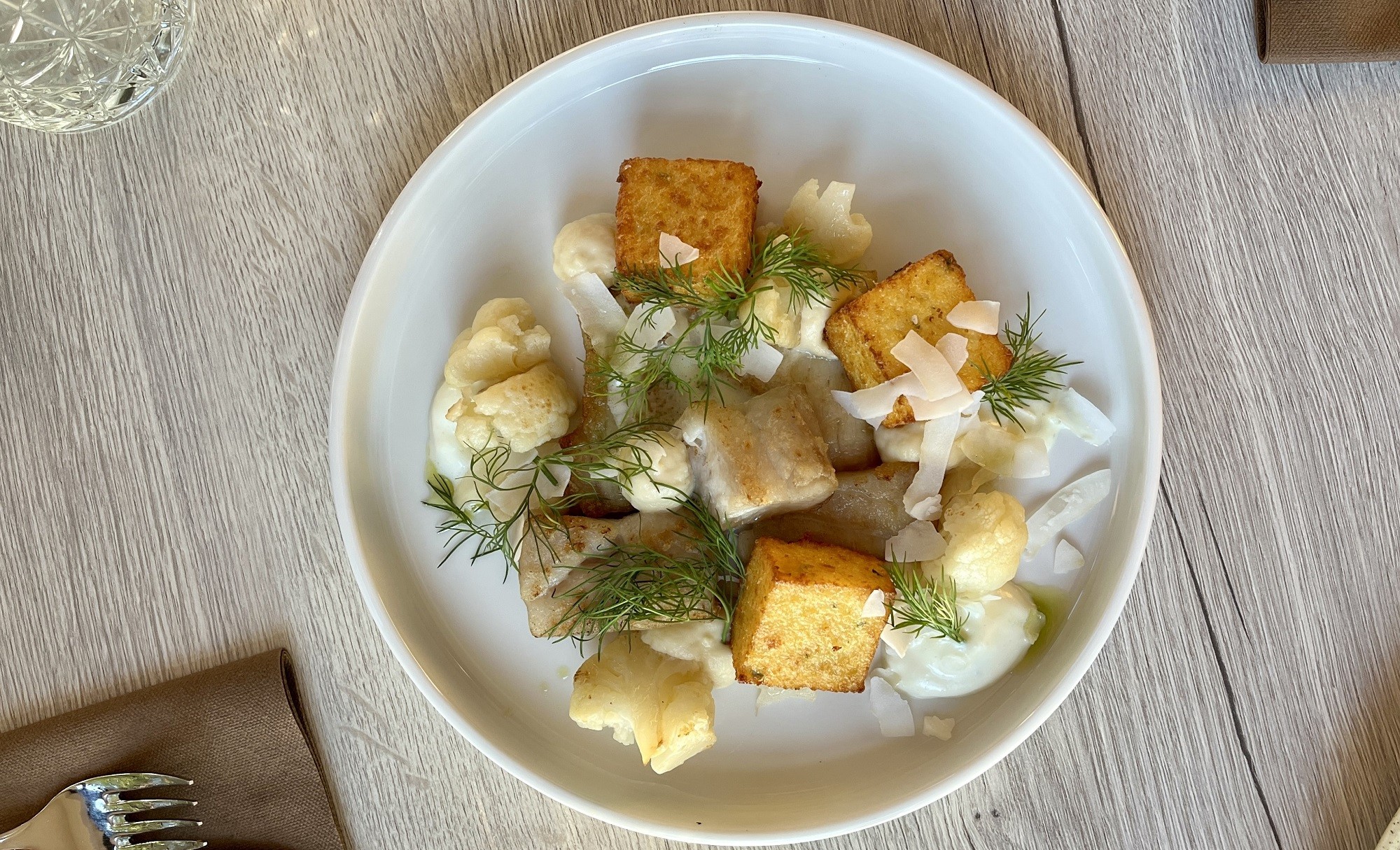 Platí to aj o zeleninovej polievke minestrone, ktorú sme mali v rámci obedového menu (11,90 €), aj tá cestou na náš stôl vychladla. Ochutená však bola dobre, zeleniny veľa, to oceňujeme. Inak, tak trochu nám pripomínala známu tukožrútsku polievku, ktorá sľubuje zázraky do siedmich dní. Druhý chod, grilovaný ostriež nílsky s polentou, karfiolom na masle a hoblinami kokosu bol chuťovo málo výrazný, čakali sme viac. Popravde, efektný styling jedla nás zaujal viac ako jeho chuť.