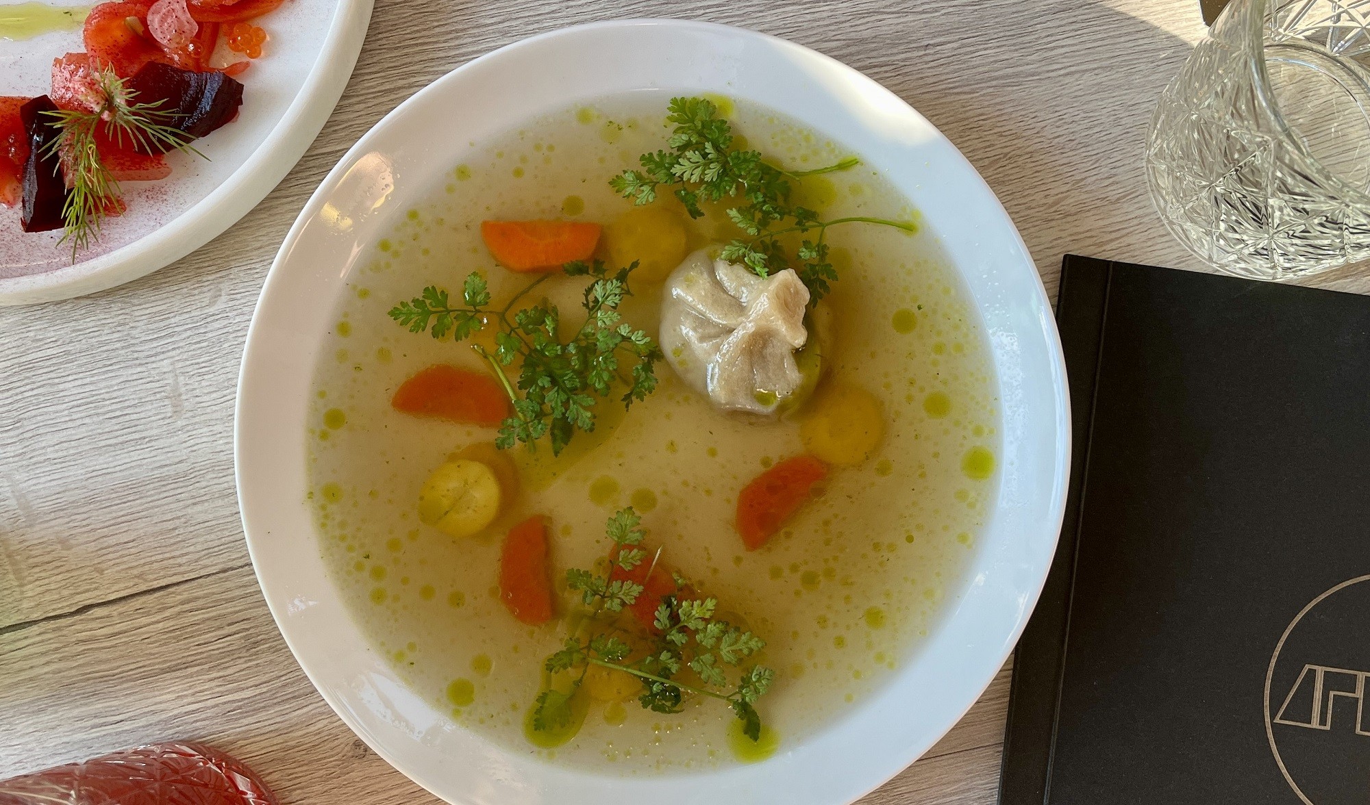 V Apolke idú zjavne ešte ďalej – prekvapením bol už Hovädzí vývar (6,50 €), v ktorom sme mali okrem koreňovej zeleniny čínsky wonton, niečo ako piroh plnený mäsom z hovädzieho chvosta. Zaujímavé riešenie, ktoré sa nám veľmi páčilo, takýchto „taštičiek“ by sme v polievke prijali aj tri kusy. Polievočka však bola, žiaľ, trochu slabá, hovädzí vývar by mal mať silnú, výraznú chuť, navyše nebola dosť teplá.