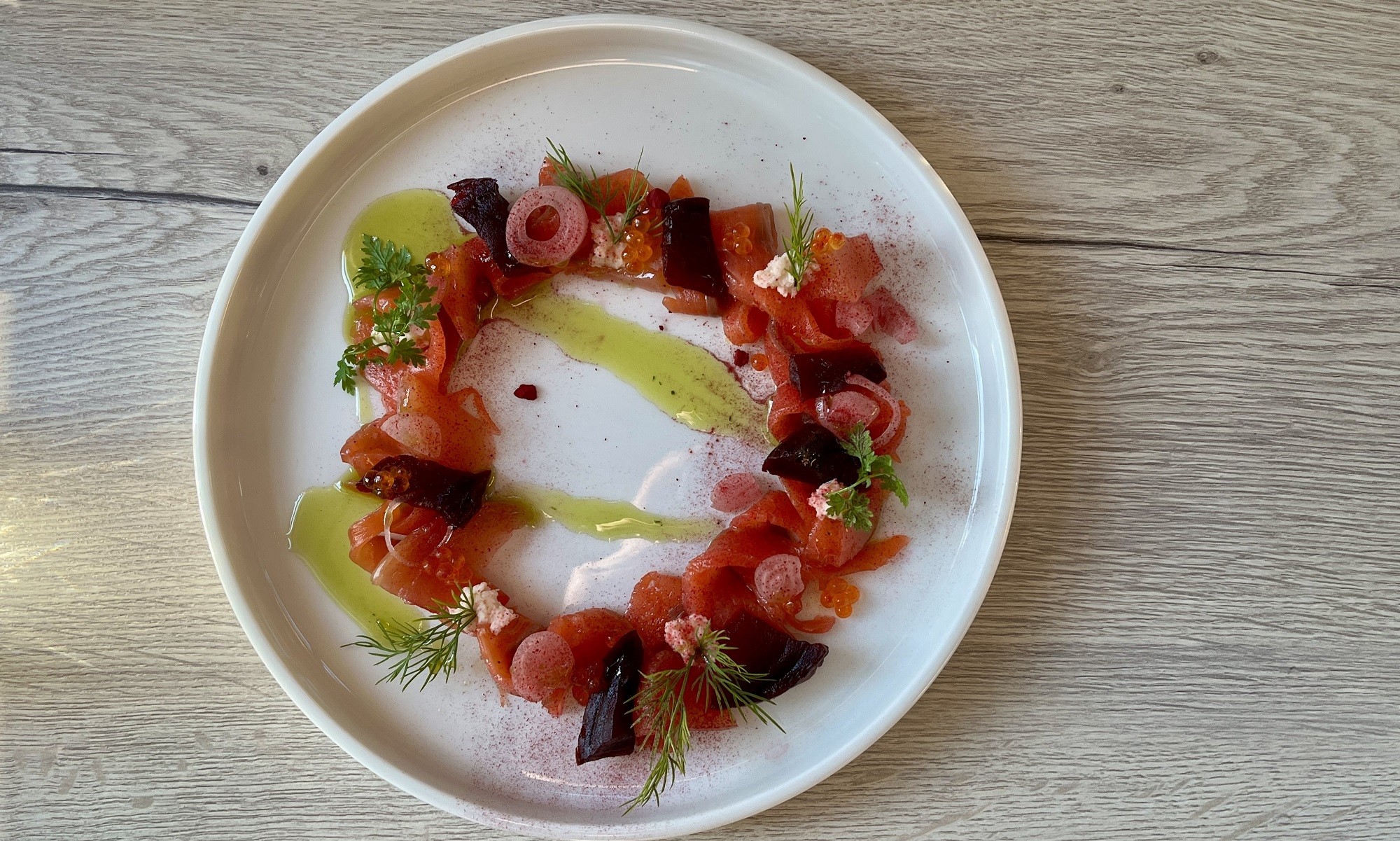 Vyskúšali sme i predjedlo Marinovaný pstruh (9,90 €) s opečeným kváskovým chlebom. Mäsko (surové!) bolo výborné, kto sa obáva príliš výraznej rybacej chuti, tak v tomto prípade zbytočne. Pri dochucovaní pstruha sa hovorí, že menej je viac - ten náš spolu s červenou repou, chrenom, nakladanou šalotkou a kôprom bol skutočnou delikatesou. A styling opäť úžasný.