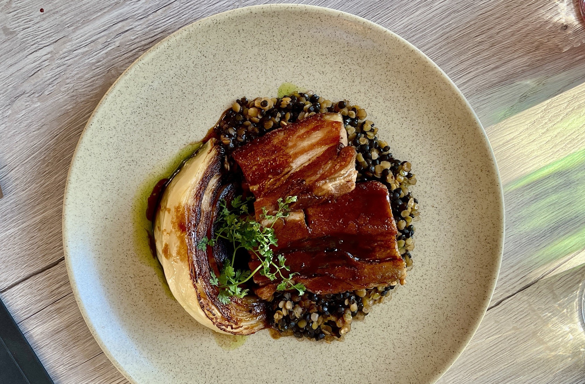 K Pečenému bravčovému boku (16,90 €) servírujú šošovicu beluga a grilovanú kapustu, čo bolo pre nás malým prekvapením. Bôčik pripravili skvelo, šošovica (mimochodom, pôvodom z Indie) bola tiež chutná a ako príloha ľahká, kapusta zas dodávala jedlu šťavnatosť. Fakt, že textúr v ňom bolo viac, výslednému dojmu len prospel.