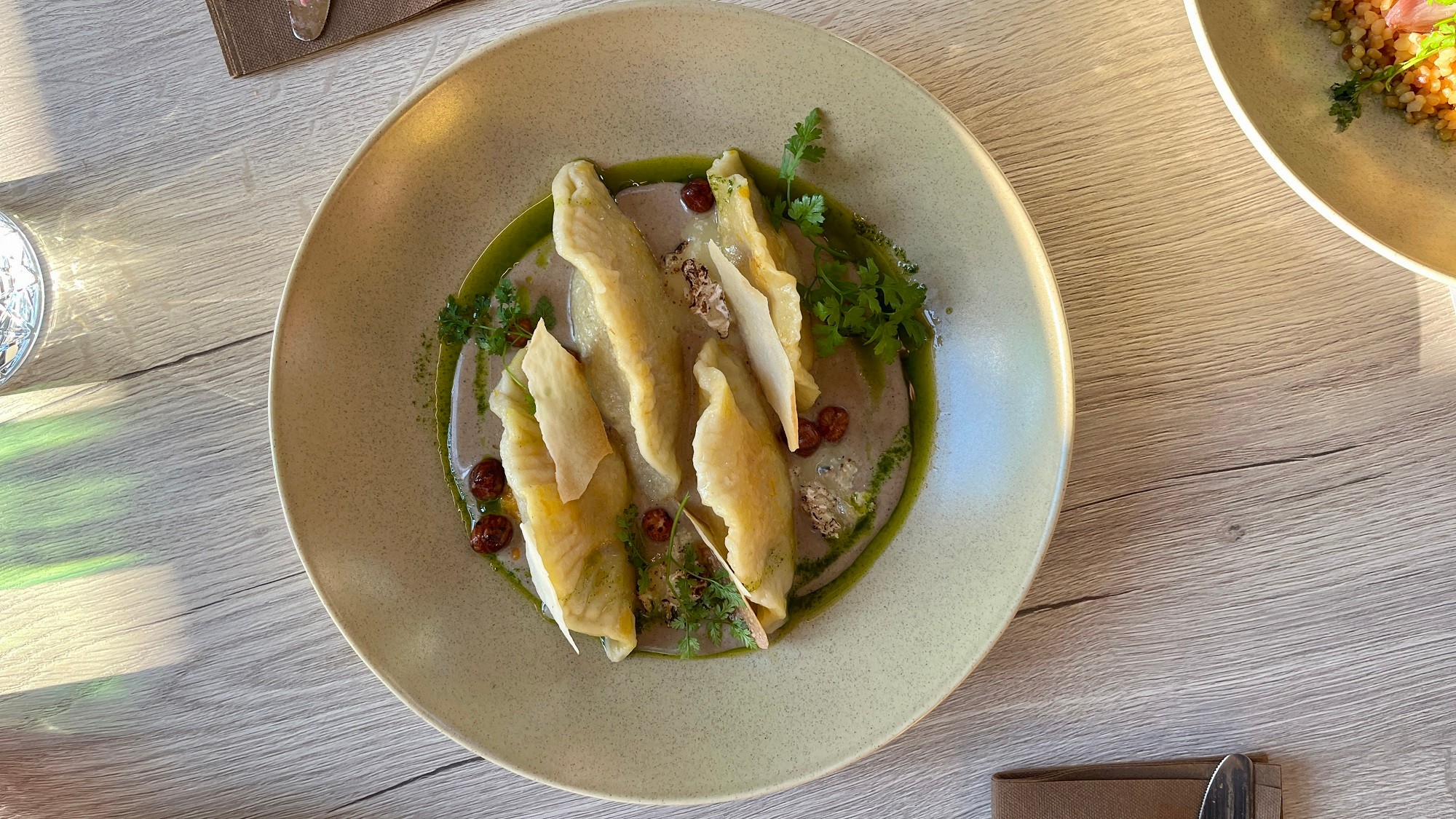 Potešili i Pirohy plnené pečenou tekvicou (14,90 €) s rôznorodými pridanými chuťami, ktorých výsledkom bol nový, netradičný zážitok. Chutné taštičky z mäkučkého cesta posunula na ešte vyšší level omáčka z čierneho cesnaku, ocenili sme takisto ovčí syr a lieskovce na tanieri, no ešte väčším prekvapením bolo, že majster kuchár spestruje túto lahôdku aj chipsom z bieleho jogurtu.