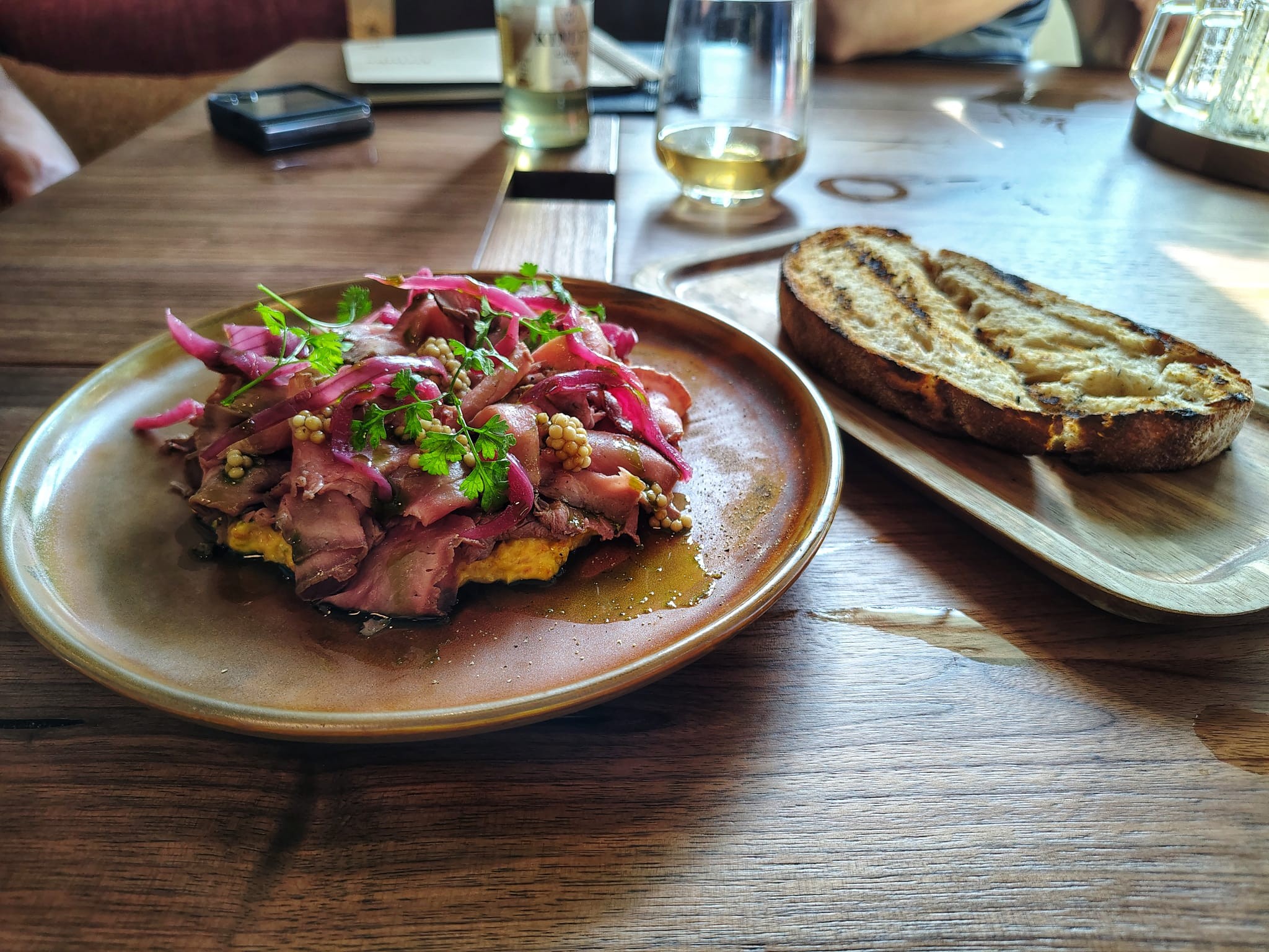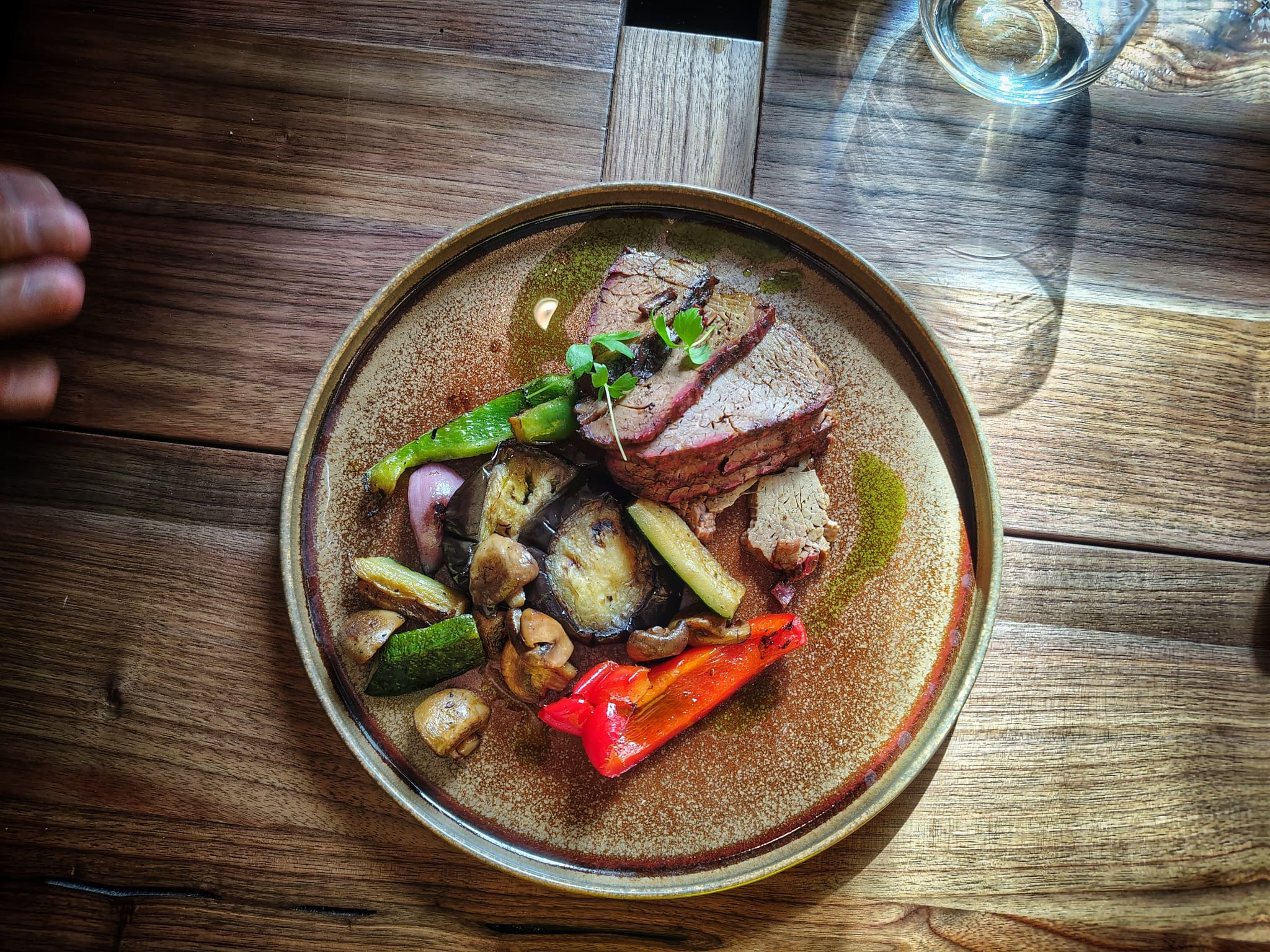 Začali sme predjedlom Roastbeef (12,90 €), tu sme na pekne nastajlovanom tanieri dostali tenké šťavnaté plátky hovädzieho, ktoré doplnila koreňová zelenina, majonéza aj horčičné semienka. Nie bežná kombinácia chutí spolu výborne ladila. Špecialitu sme zajedali chrumkavým chlebom opečeným na grile, ktorý bol taktiež vynikajúci. Predjedlu naozaj nemáme čo vyčítať.