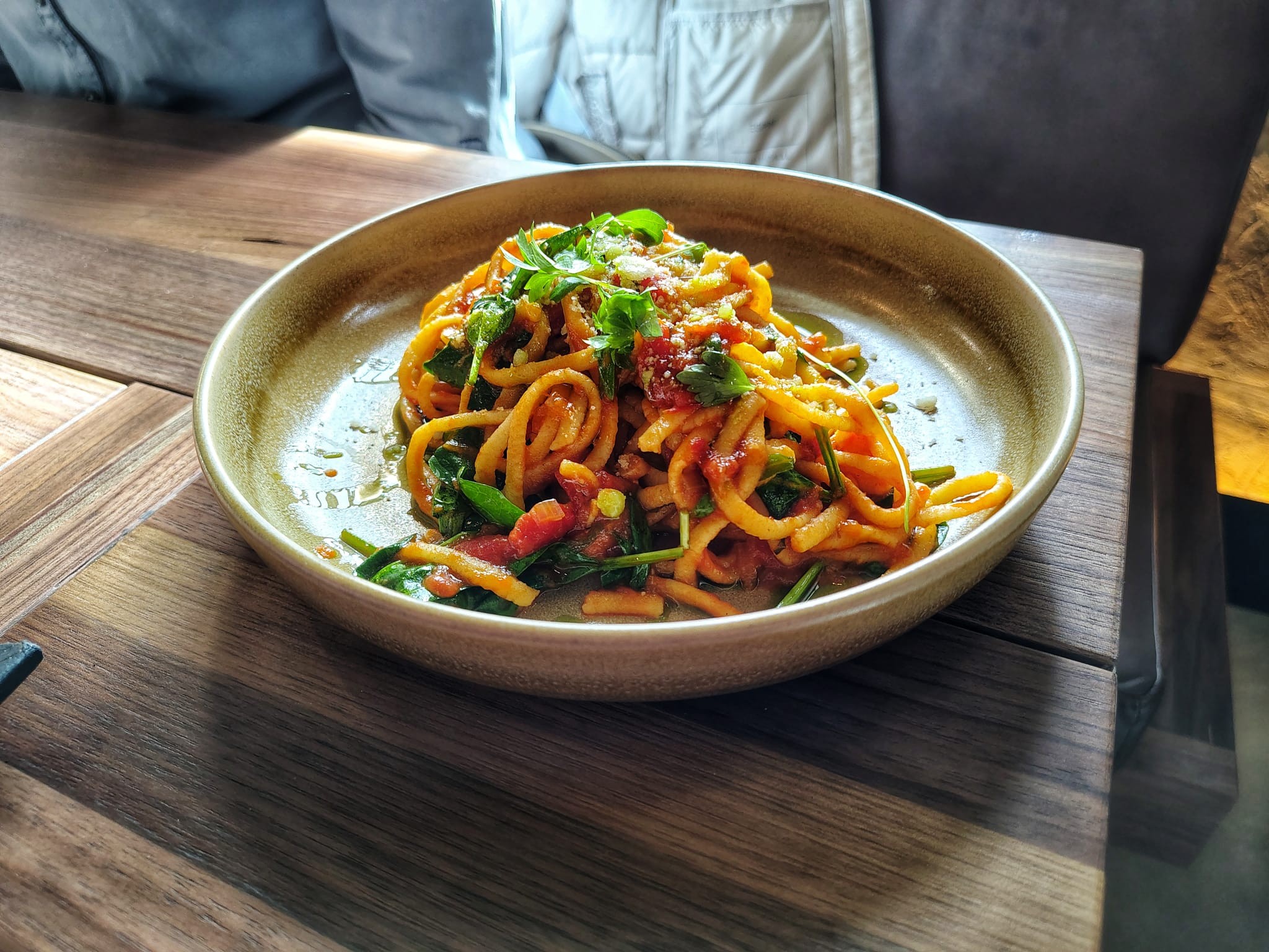 Príjemné boli tiež Paradajkové linguine (13,20 €), jednoduché jedlo, ktoré môže chutiť klasicky, ale tiež skvele. To naše bol druhý prípad aj vďaka tomu, že si cestoviny robia sami. Krásne žlté hrubšie rezance uvarené al dente osviežil mladý špenát s bazalkou, a najmä paradajková omáčka s kúskami paradajok. Jedlo bolo šťavnaté, chuťovo síce menej výrazné, ale odolali sme zlozvyku pridať trochu soli, aby sme ho zažili v autentickej podobe.
