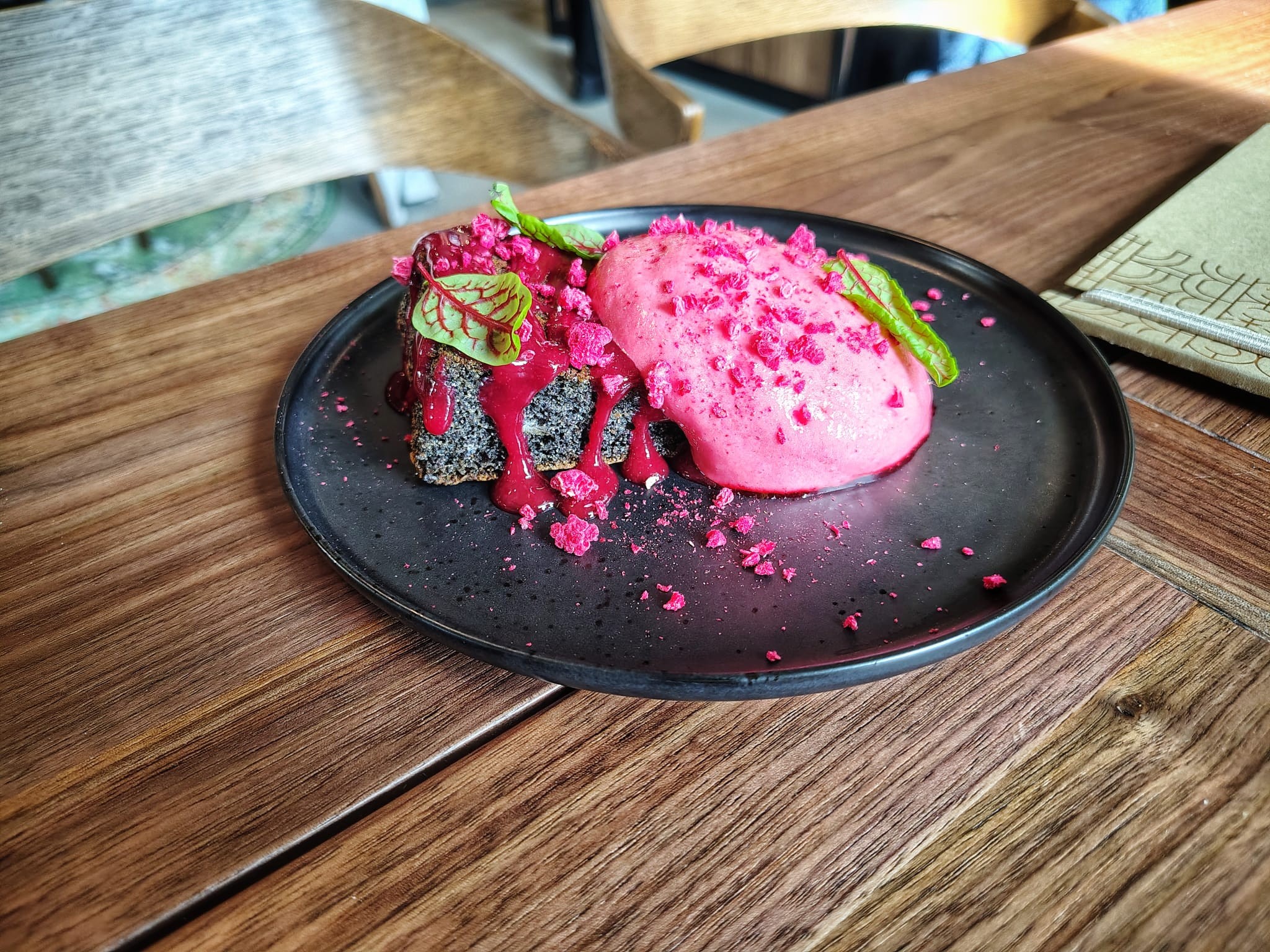 Hodovanie sme ukončili dezertom s názvom Mak a malina (6,80 €), čo bol makový koláčik osviežený malinovým kompótom a malinovou penou. Chutil ako od mamy, bol veľmi šťavnatý, hutný, naozaj makový, plný a sýty. Malinová pena bola trošku prisladká, ale chutila autenticky.