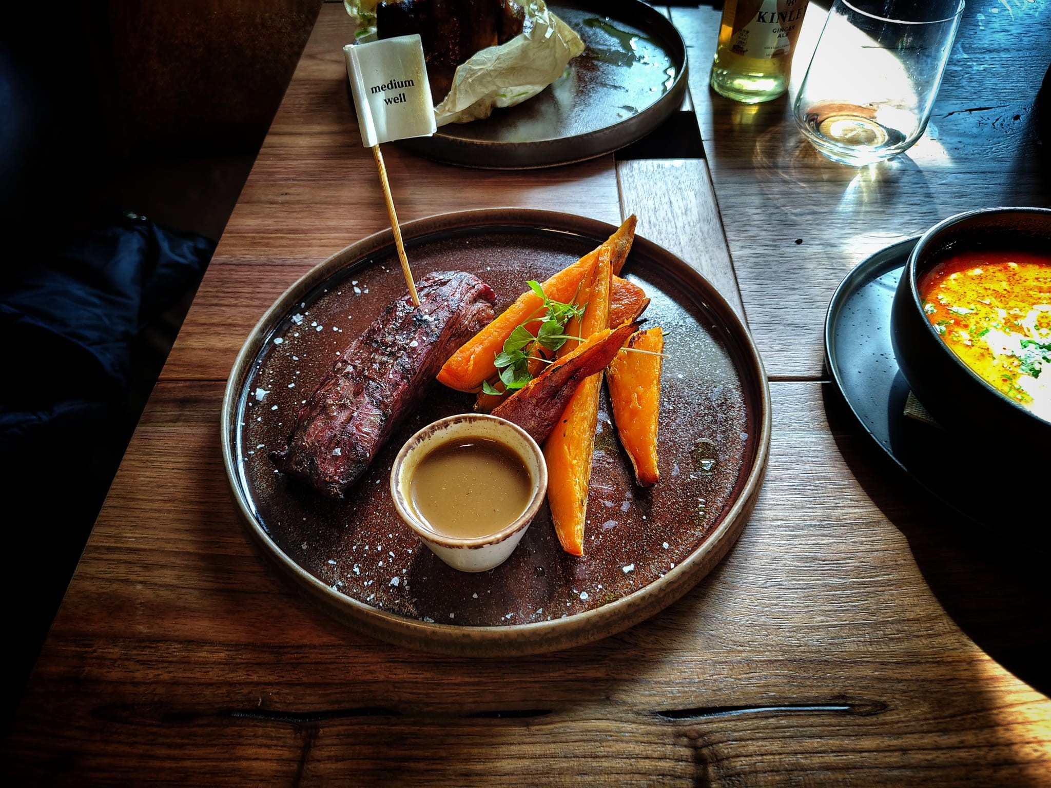 Zaujal nás tiež grilovaný Flank stejk (20,90 €), ku ktorému sme mali Pečené bataty s bylinkami (4,90 €) a tradičnú silnú mäsovú omáčku Demiglas (3,30 €), takže všetko komplet nás to napokon vyšlo na takmer 30 eur. Fakt je, že nám pripravili ozaj pekný kúsok kvalitného stredne prepečeného (medium) stejku. Rez hovädzieho zo spodnej časti brušného svalu mal dokonalú krustu, bol plný chuti, jemný a šťavnatý a krájal sa výborne. Zemiaky bataty boli tiež jedna báseň, aj demi glace omáčku robia dobre. Tej sme si dopriali striedmejšie, aby sme si užili čistú chuť či už mäsa, alebo batatov.
