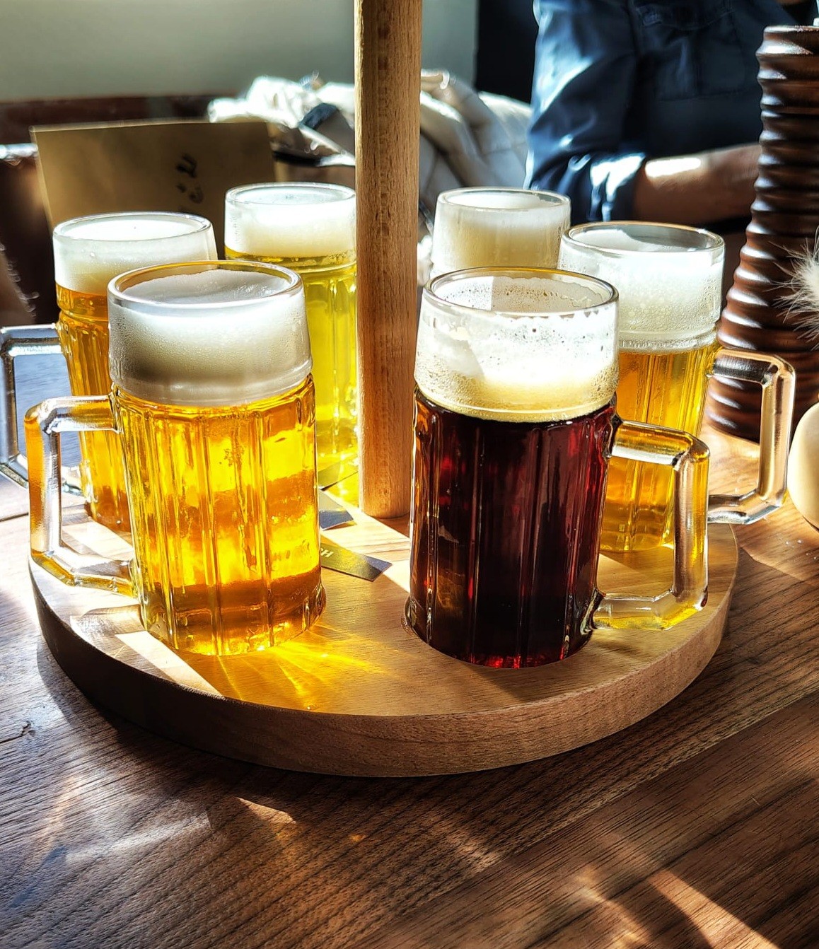 No a ešte k pivku. Dopriali sme si Ochutnávku šiestich pív (7,50 € za všetky dohromady), tu nám v menších 1,25 l pohároch na drevenom okrúhlom podnose priniesli IPL 11°, IPA 12°, APA 13°, BLONDE ALE 10° a ďalšie - jedno s výraznejšou chmeľovou arómou a chuťou, druhé s tónmi tropického ovocia, tretie horkejšie...