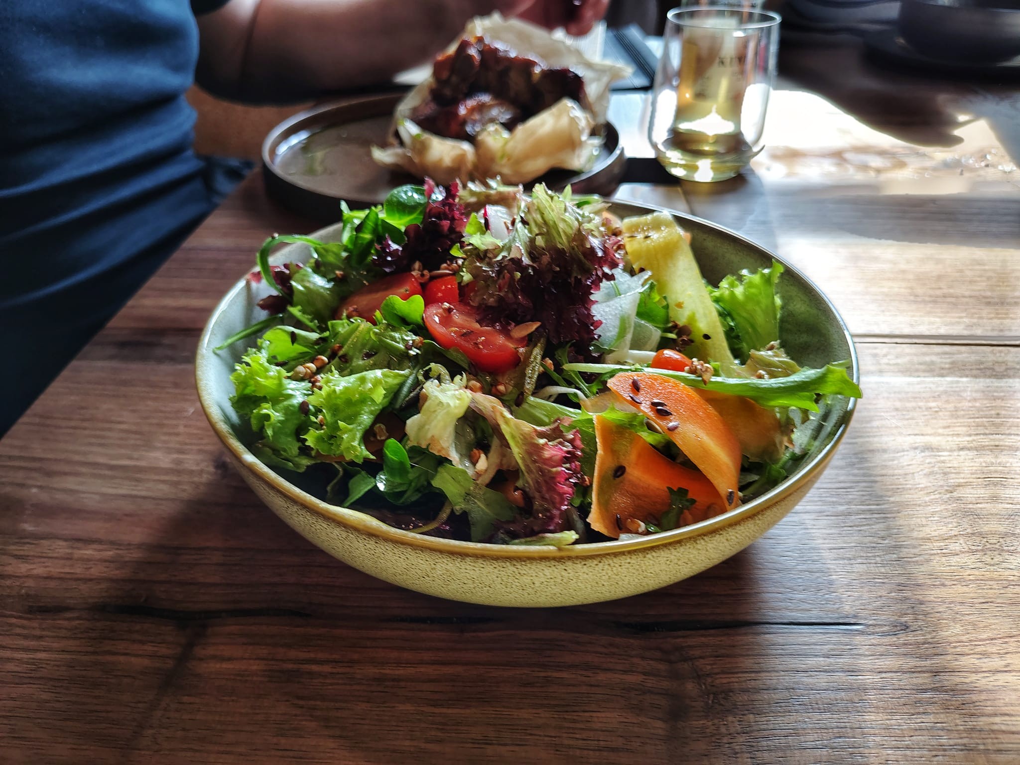 Viac nás potešila príloha, ktorú sme si zvolili k rebierkam, a to ľahký svieži Záhradný šalát (9,90 €). Miešaný listový šalát s farebnou mrkvou, reďkovkami, cherry paradajkami, uhorkou a pečenými jadierkami bol veľmi fajn, veľa tu zjavne urobil skvostný dresing z vínneho octu a medu.