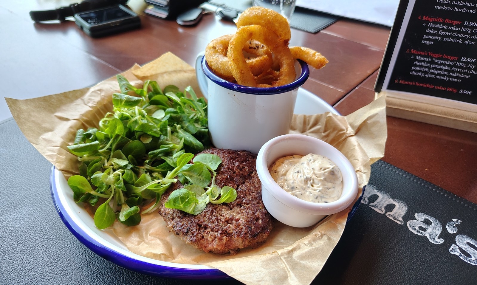 Napokon sme si objednali samotnú placku Mama´s hovädzie mäso (5,50 €) a k nej všetko, na čo sme mali práve chuť - Cibuľové krúžky (3,70 €), Mama´s tatarku (1,50 €) a Hranolčeky (3,50 €), tie nám však zabudli priniesť. Obsluhujúca milá slečna síce bola ochotná chybu hneď napraviť, nakoniec sme usúdili, že nám až tak nechýbajú. Inak, svieže lístky polníčka (valeriánky poľnej) sú v rámci ceny mäsa, ktoré sme vychválili už vyššie. Takže k tým cibuľovým krúžkom: sú dobré, cestíčko chrumkavé a nie mastné, namočené v domácej tatárke je to chutný snack, alebo teda aj príloha k mäsovej placke.