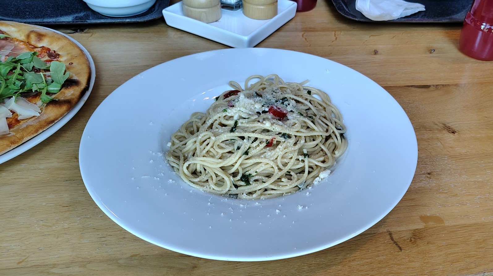 Ďalšou špecialitkou na objednávku boli jednoduché špagety Pasta Aglio Olio (7,90 €), ktoré milujeme. Čakali sme autentické talianske jedlo, no táto verzia zaostávala, chýbala jej pikantnosť. Zjavne pri príprave použili málo restovaného cesnaku a čili papričiek, ktoré majú mať hlavné slovo. Cestoviny však boli uvarené tak, ako majú byť, al dente, parmezán chutný, páčilo sa nám i servírovanie na veľkom tanieri.