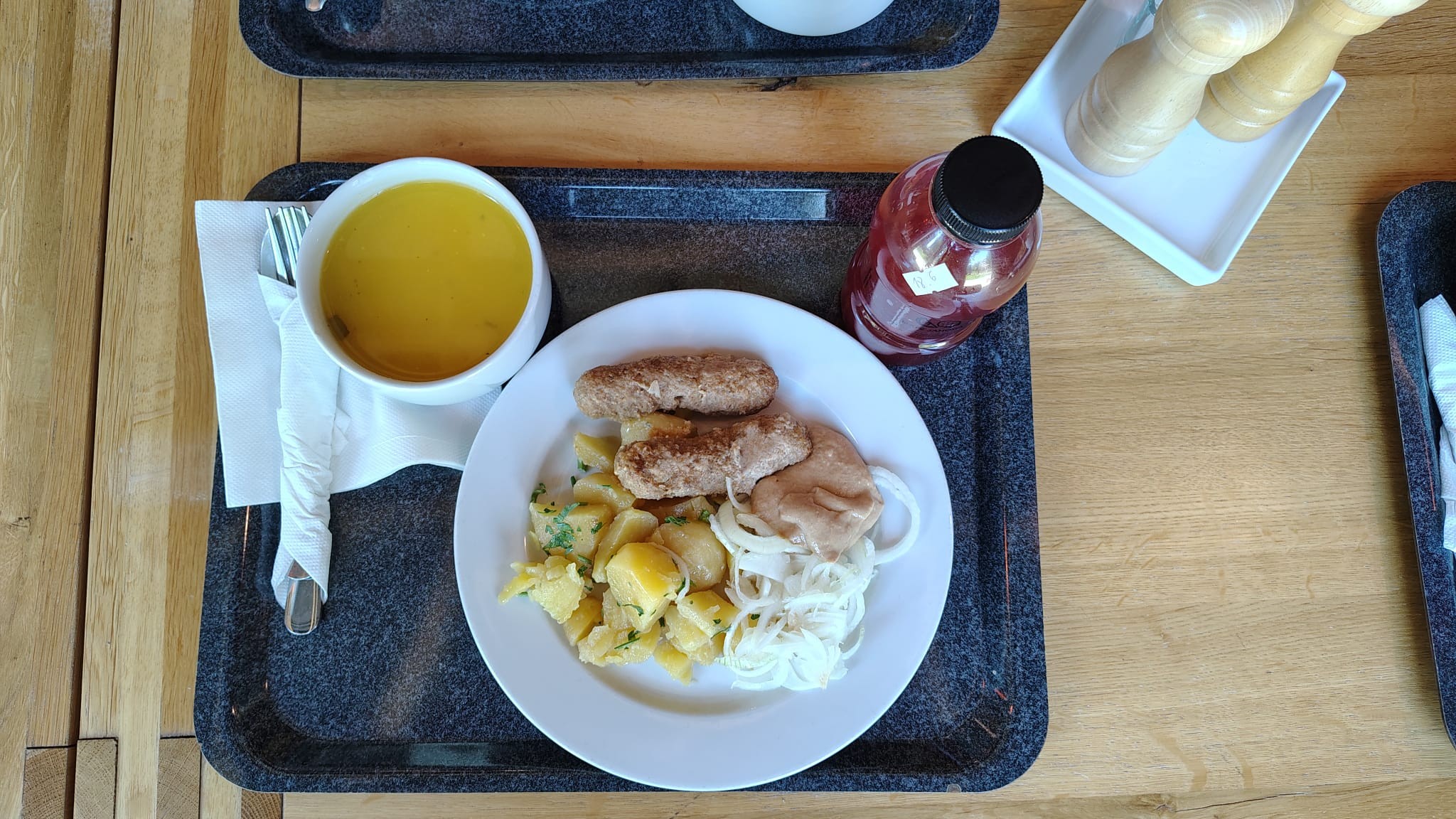 Na Čevabčiči s cibuľou, horčicou a varenými zemiakmi (6,50 €) sme sa ozaj tešili, ale od balkánskej klasiky malo jedlo ďaleko. Mäsové „valčeky“ boli na náš vkus málo mäsové a málo opečené, chcelo to ešte tak dve minútky, aby boli zlatisto hnedé s chutnou kôrkou, tá nám chýbala. Zemiaky boli typické jedálenské, stačilo ich len dosoliť. Ako rýchly obed, za ktorý nedáte majetok, jedlo postačuje, ale veľký zážitok sa nekonal.