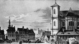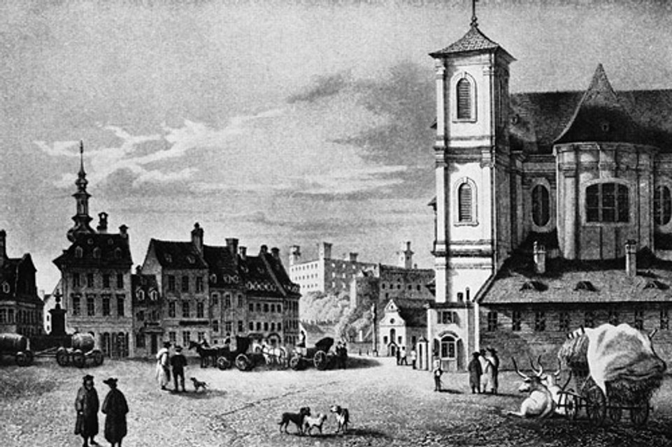 Možno ho k tomu inšpirovala aj impozantná ruina kráľovského paláca v strede veduty. Pod palácom, ktorý vyhorel v roku 1811, vidno jednoduchý kostol kapucínov, ešte s pôvodným priečelím z prelomu 17. a 18. storočia. Veža Michalskej brány je čiastočne zakrytá meštianskym domom z obdobia po roku 1830.