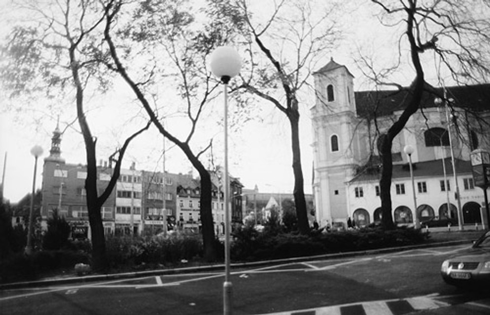 Kostol vpravo vznikol ako súčasť kláštora trinitárov a bol zasvätený rádovému svätcovi Jánovi z Mathy. Stavali ho od roku 1717 do roku 1750. Jozef II. po roku 1780 kláštor zrušil. V 19. storočí ho prestavali na sídlo župného úradu, kostol sa stal farským. Podľa svedectva starších grafických listov boli dve veže kostola zavŕšené vysokými bohato profilovanými strechami s cibuľovitými motívmi. Nie je jasné, kedy a prečo ich odstránili. Provizórne zastrešenie vo forme nízkych ihlancov s preliačenými stenami, aké dokumentuje aj Rohbockova kresba, prenesená do rytiny J. Umbachom v Darmstadte, sa zachovalo doteraz. Len pôvodný drevený šindeľ je už asi 100 rokov nahradený plechom.