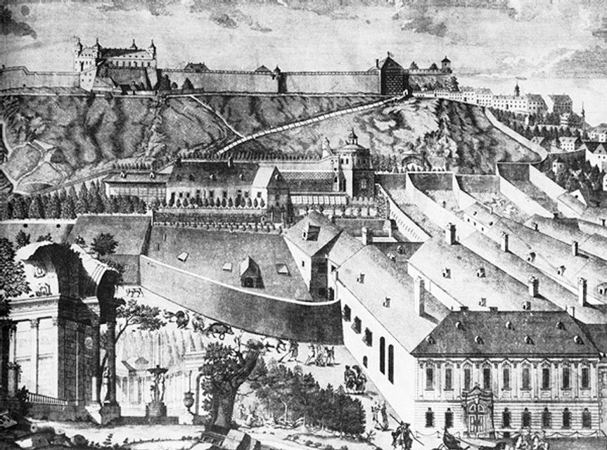 V západnej časti ulice Veľká Vydrica, neďaleko vtedy už obostavanej ruiny Vodnej veže, postavili v poslednej tretine 18. storočia medzi meštianskymi domami výstavný šľachtický palác. Na jeho mieste stálo predtým niekoľko menších domov. Nový palác mal pomerne dlhú fasádu (9 okenných osí). Do paláca sa vstupovalo veľmi výrazným mohutným kamenným portálom, ktorý ešte zachovával barokové formy. Fasáda už bola riešená v duchu oveľa strohejšieho klasicizmu.