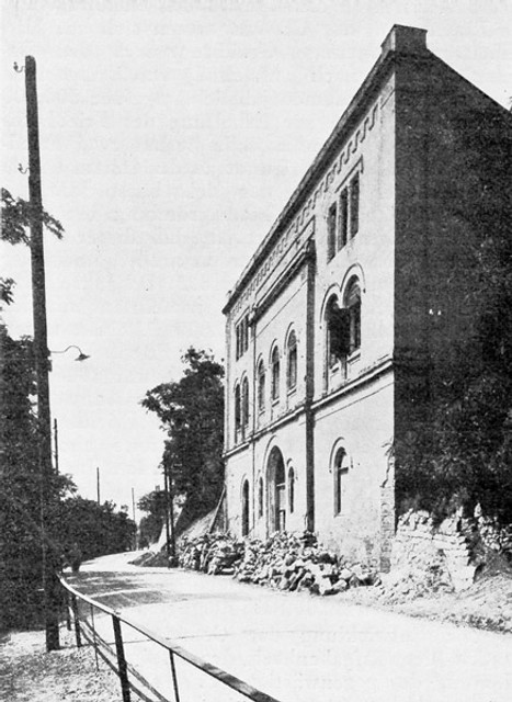 Na jeho mieste stála pôvodne stavba od staviteľa Ignáca Feiglera zo 60. rokov 19. storočia. Monumentálny trojpodlažný objekt bol postavený pri svahu tak, že jeho prvé poschodie bolo na úrovni cintorína a obsahovalo rozlúčkovú sieň („Zeremonienhalle“). Druhé poschodie sa prejavovalo len zo strany ulice a obsahovalo skladište. Na strane cintorína sa objekt javil ako nízka prízemná stavba.