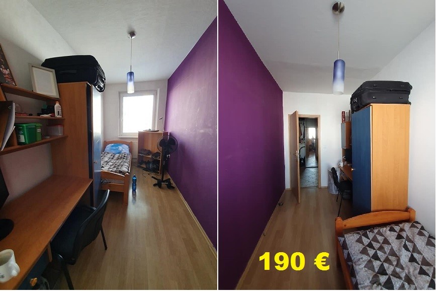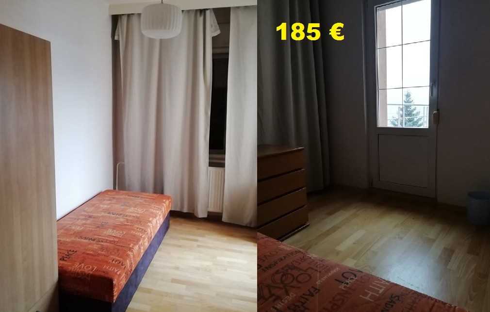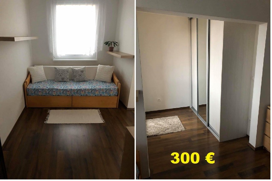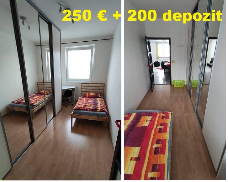 „Ponúkam na prenájom menšiu izbu s veľkou vstavanou skriňou v 4-izbovom byte v Petržalke. V ďalších 2 izbách bývajú po 1 chalanovi a obývačka je spoločná, takže v celom byte bývajú vždy maximálne 3 osoby. Mesačný nájom je 250 € vrátane energií a internetu, vratný depozit je 200€. Izba dostupná od 1. februára,“ napísal do inzerátu pán Miroslav. Výhodou ponúkanej izby je veľký roldor, kde sa asi zmestí veľa oblečenia a osobných vecí, ale samotný životný priestor pre podnájomníka je dosť limitujúci...