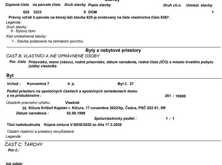 Syn Kajetána Kičuru, Krištof Kajetán Kičura nadobudol v Bratislave dva byty vo veľmi lukratívnej lokalite na Konventnej ulici 7 v historickom centre, o čom sme sa presvedčili aj na stránke katastra. Kičura mladší narodený v roku 1999 jeden z bytov, konkrétne byt číslo 24 na treťom poschodí na Konventnej 7 kúpil iba 18. marca 2020, teda v stredu minulý týždeň. To však nie je všetko. Iba jeden deň predtým, teda 17. marca, sa stal majiteľom aj ďalšieho bytu v tej istej budove, konkrétne bytu číslo 27 na štvrtom poschodí. Či je možné byty nad sebou prepojiť a vytvoriť mezonet, zatiaľ nevieme posúdiť. Ide však o nadstavbu pôvodnej historickej budovy (foto nižšie).