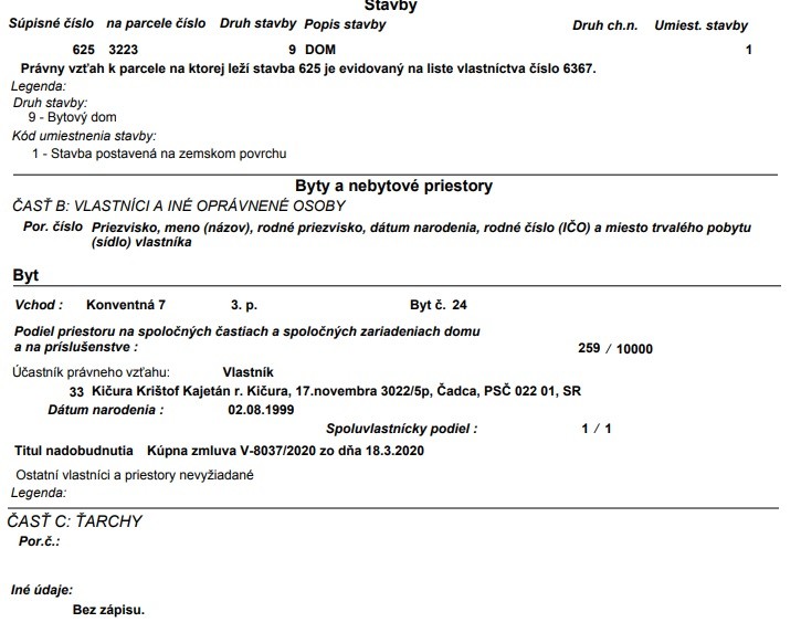 Zápis z katastra o nadobudnutí bytu Kičurom mladším.