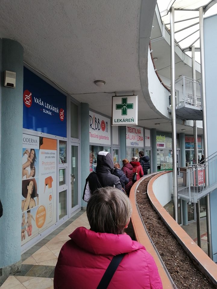V nákupnom centre Slimák na Hálkovej ulici bol pred textilnou galantériou takisto pomerne dlhý zástup ľudí.