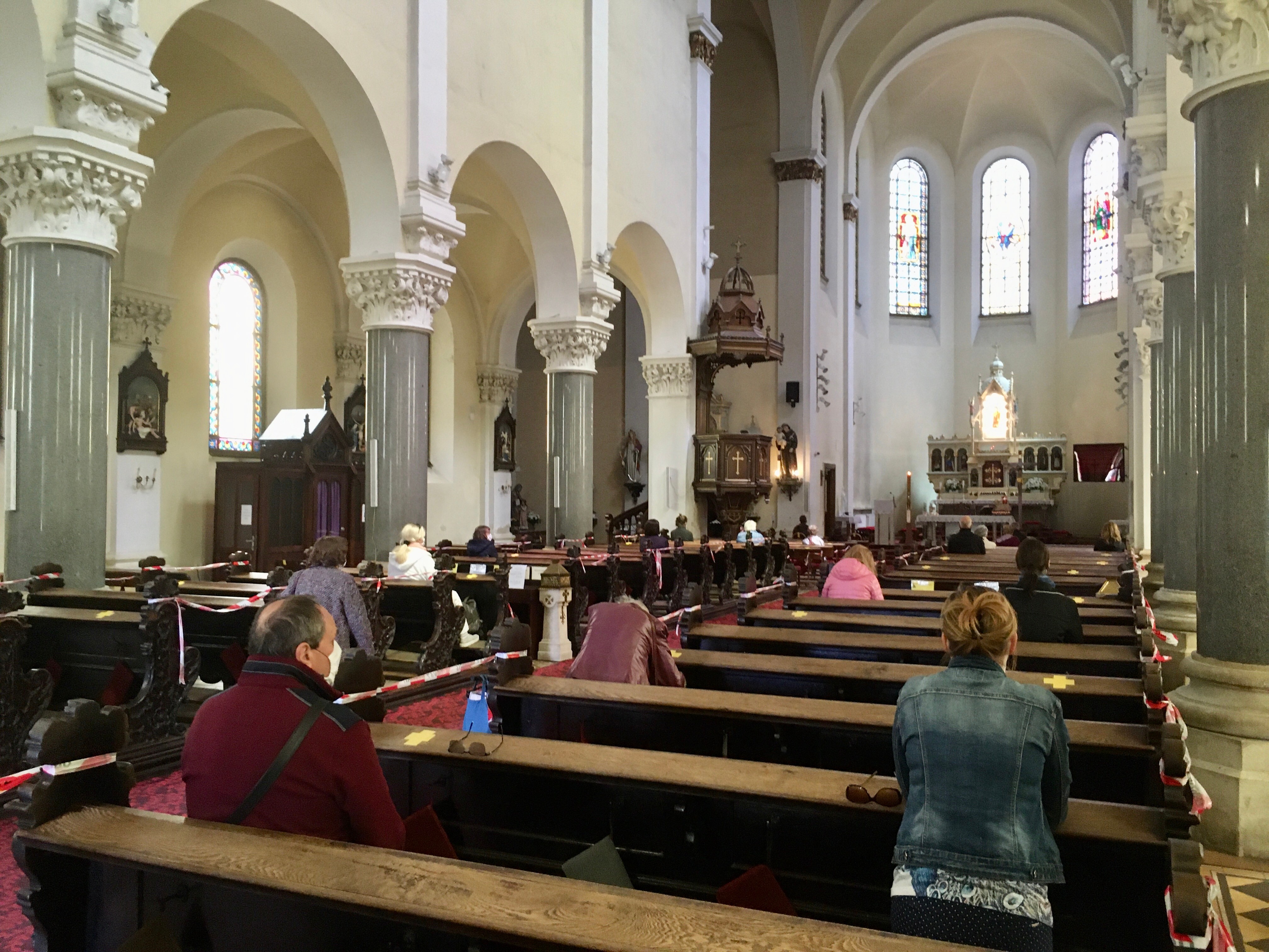 Od stredy 6. mája sú povolené verejné sväté omše za účasti veriacich, ktoré sa na Slovensku nekonali od marca. Mnohé kostoly obnovili ich slúženie v rovnakých časoch, ako boli pred zavedením karantény. Príkladom je Blumentál. Vo štvrtok na obed sme sa doň zašli pozrieť na omšu. Nebol problém sa dostať dnu, keďže ľudí bolo oveľa menej ako aktuálnych 120 miest na sedenie a 20 na státie.
