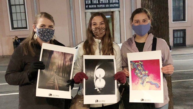 Diela na výstave Ghost Town.NYC si záujemcovia mohli pozrieť len na digitálnych obrazovkách z ulice - covid aj v tomto prípade zamiešal karty. Na úvodnej fotografii vidíte newyorské študentky, z ktorých jedna (vpravo) má v rukách akrylovú maľbu Petry Štefankovej „Žena s dlhými vlasmi“.