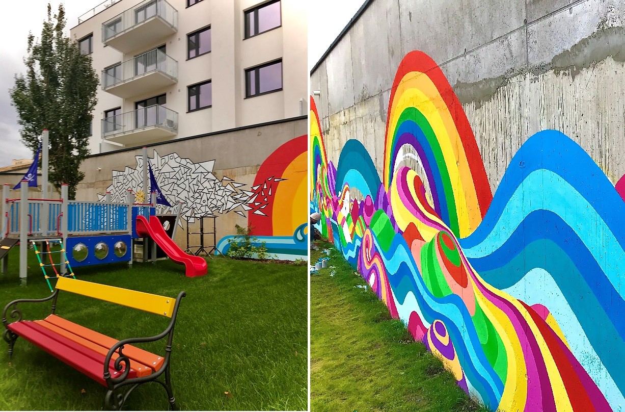 Kompletnú rekonštrukciu škôlkarského dvora ukončila mestská časť v spolupráci so spoločnosťou Finep koncom novembra. Spustnuté ihrisko sa zmenilo na nepoznanie, úpravy sa dočkala aj samotná budova materskej školy. Pôvodne sivé múry oživili svojimi dielami mladí výtvarníci, študenti z VŠVU Jozef Mnich a Erik Ždiľa. Maľby ozdobili múr, ktorý škôlku obkolesuje – zvonka i zvnútra -, a vtipným nápadom aj schodisko do škôlky, ktoré zmenili na farebné pastelky.