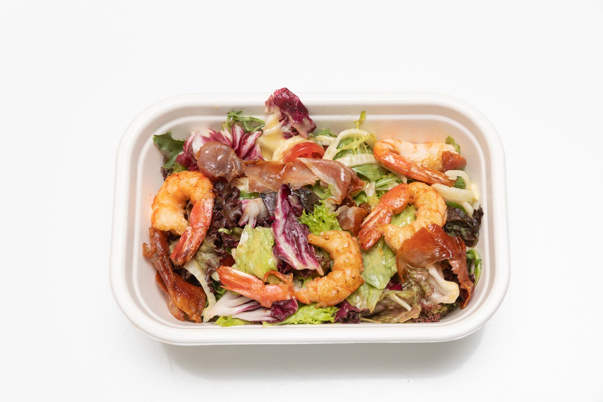 Šalát s grilovanými krevetami.