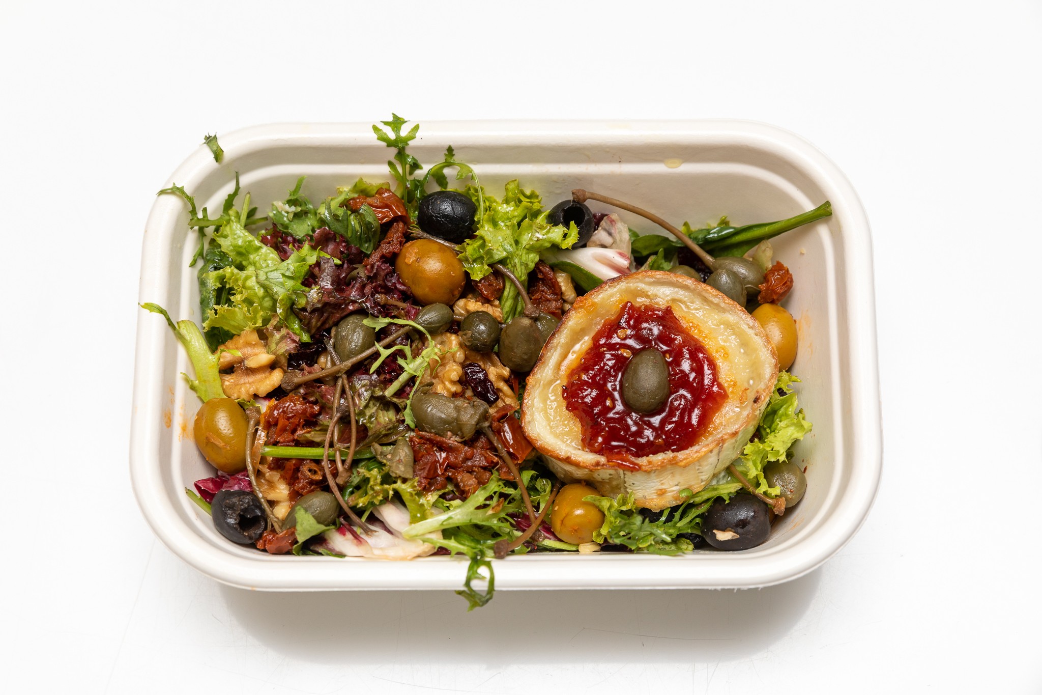 Jedálny lístok je, pravdaže, bohatší. Ak nie ste veľmi hladní, vyskúšajte Šalát s gratinovaným kozím syrom (11,29 €). Chuť krehkého syra, ktorý je sám osebe delikatesou, vynikla v kombinácii s pikantnými brusnicami. V listovom šaláte nechýbali vlašské orechy, ocenili sme tiež marinované olivy, až na citrónový dresing. Postačilo by pár kvapiek, kyslosť v šaláte trochu prekážala. Inak fajn.