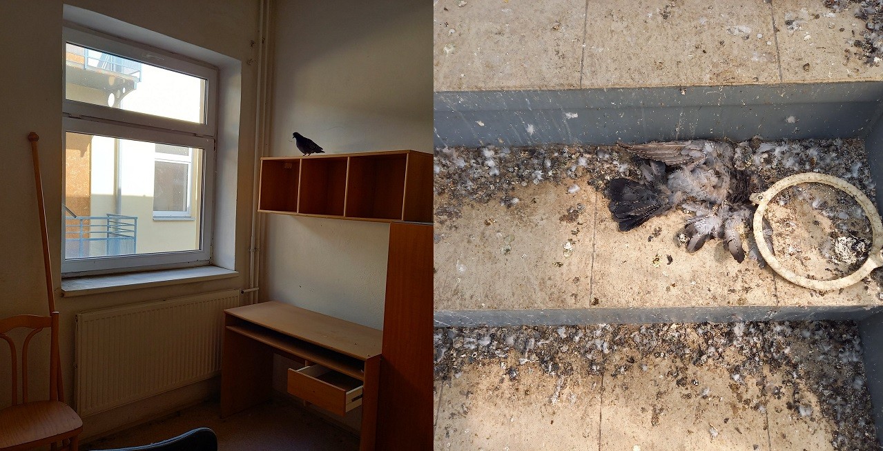 Holuby mali prístup do všetkých miestností v budove a nachádzali sa tu aj v čase návštevy fotografa...