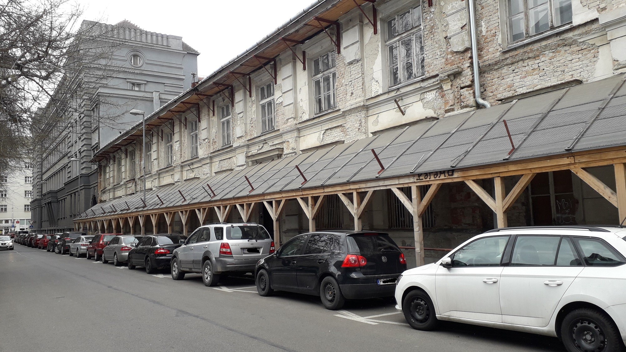 Po obvode budovy je provizórna strieška, ktorá prekrýva chodník.