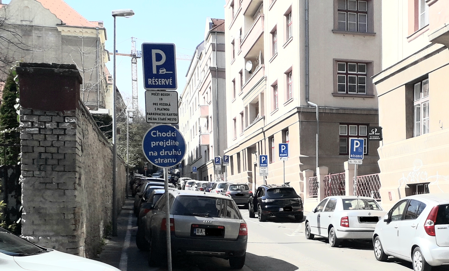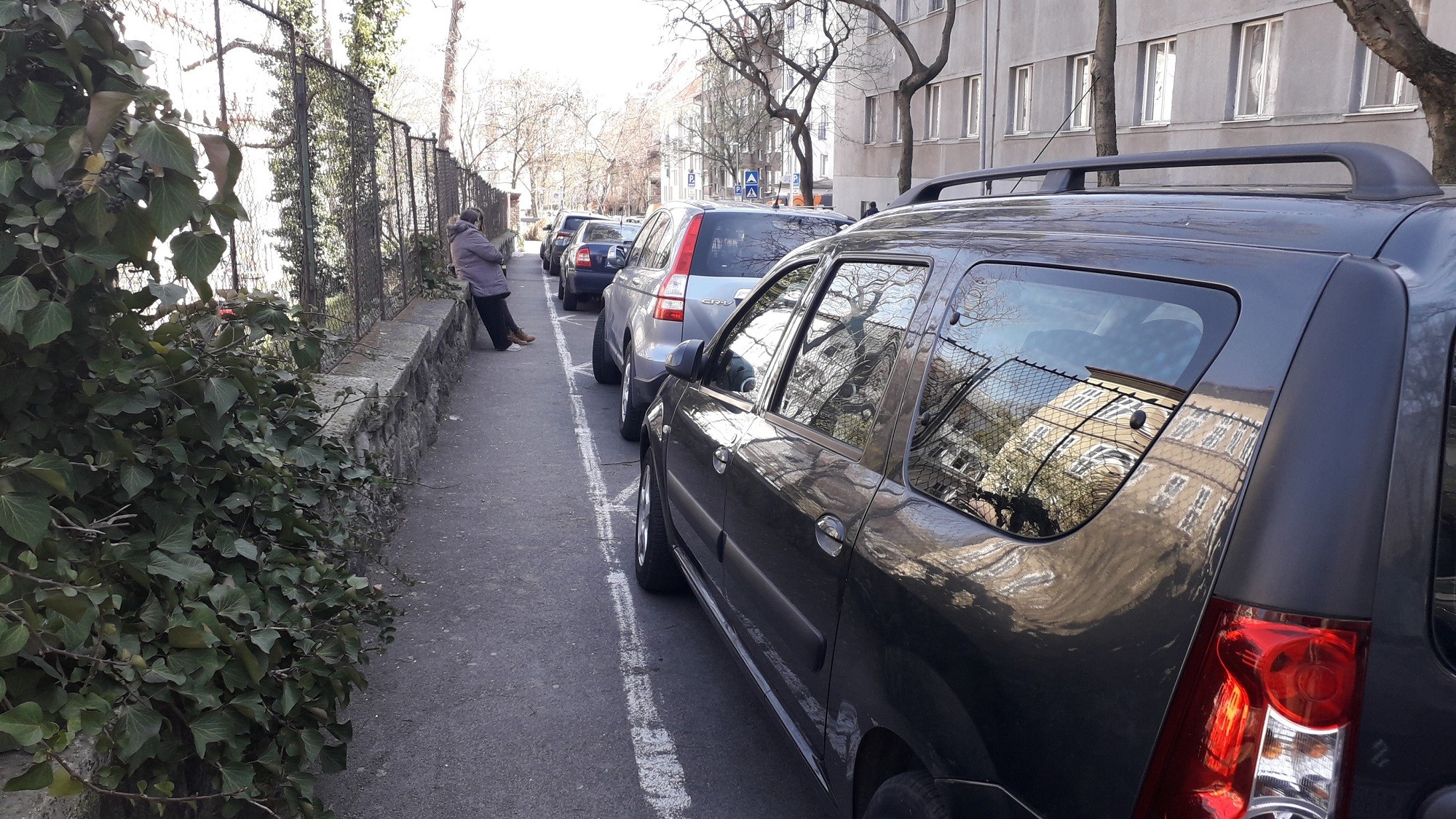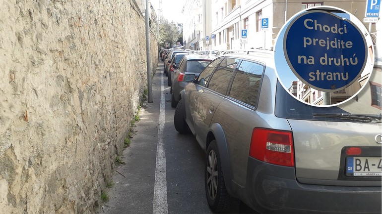 Naša úvodná fotografia je zo Zochovej ulice, no podobne to vyzerá aj na ďalších uliciach v okolí. Vďaka dopravnej značke IP 14b totiž neplatí pre vodičov pozdĺžne parkujúcich áut povinnosť nechať pre chodcov na chodníku 1,5 m voľného miesta. Takto sa aj historická Zochova ulica pod bratislavským Hradom zmenila na veľké parkovisko, kadiaľ prejdeme len vtedy, keď musíme. Nemáme dôvod zdržať sa tu dlhšie, hoci na protiľahlej strane ulice je chodník pohodlne priechodný.