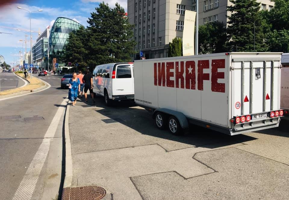 Pozornosť okoloidúcich na Pribinovej ulici vzbudzoval aj príves s nápisom, v ktorom priviezli koncertnú aparatúru...